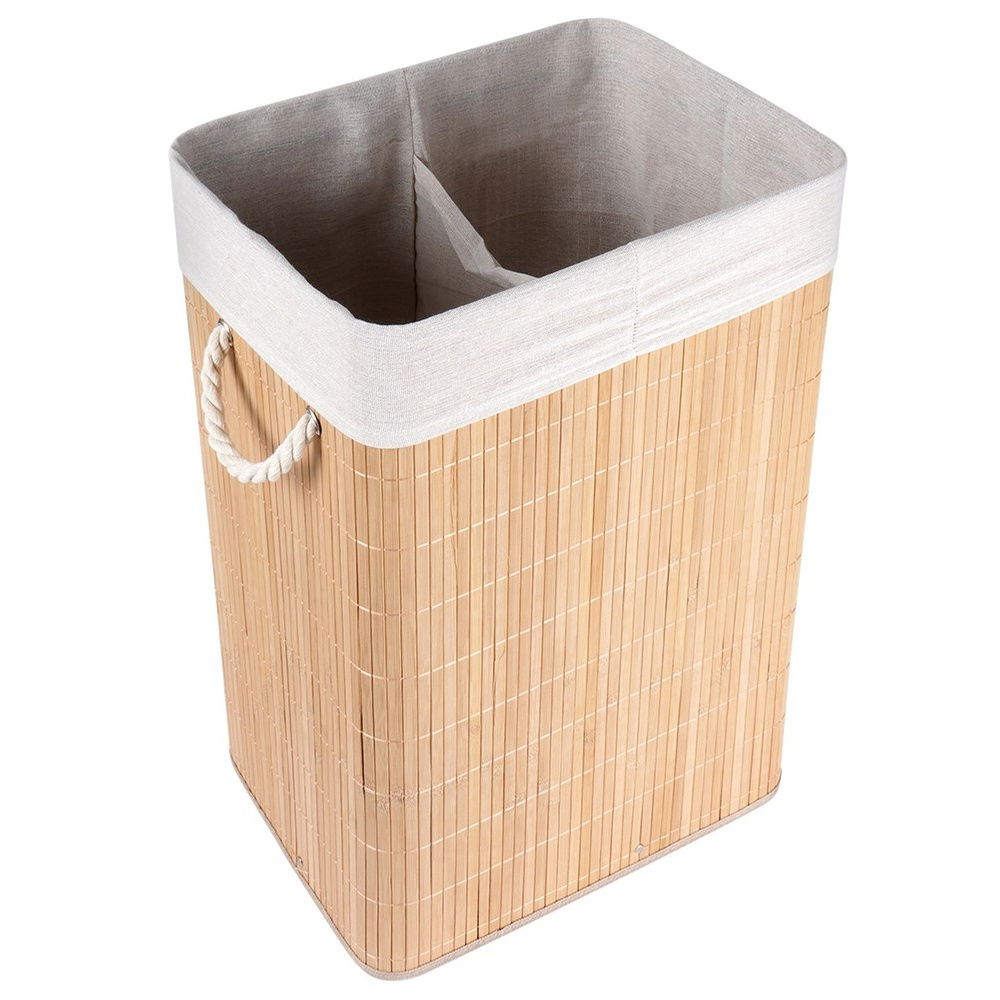 Pojemny kosz na pranie posiadający otwieraną pokrywę i dwie komory do przechowywania prania. Wykonany z wytrzymałych materiałów. Kosz prezentuje się bardzo efektownie. Prosty i naturalny wygląd sprawia, że pojemnik wkomponuje się w każde pomieszczenie. Kosz na pranie jest niezbędnym w każdej łazience. Z jego pomocą utrzymamy porządek i będziemy mieć stałe miejsce do przechowywania odzieży i bielizny do prania.