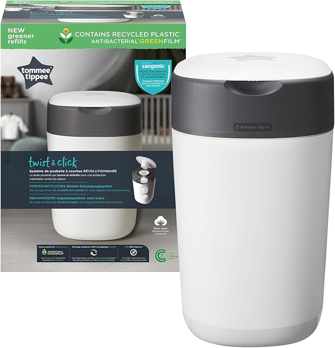 Pojemnik na pieluchy Twist & Click firmy Tommee Tippee to niedrogi pakiet startowy, składający się z kosza na pieluchy (wykonanego w technologii Sangenic), z odpowiednią ilością folii w każdej kasecie, aby owinąć około 85 pieluch.