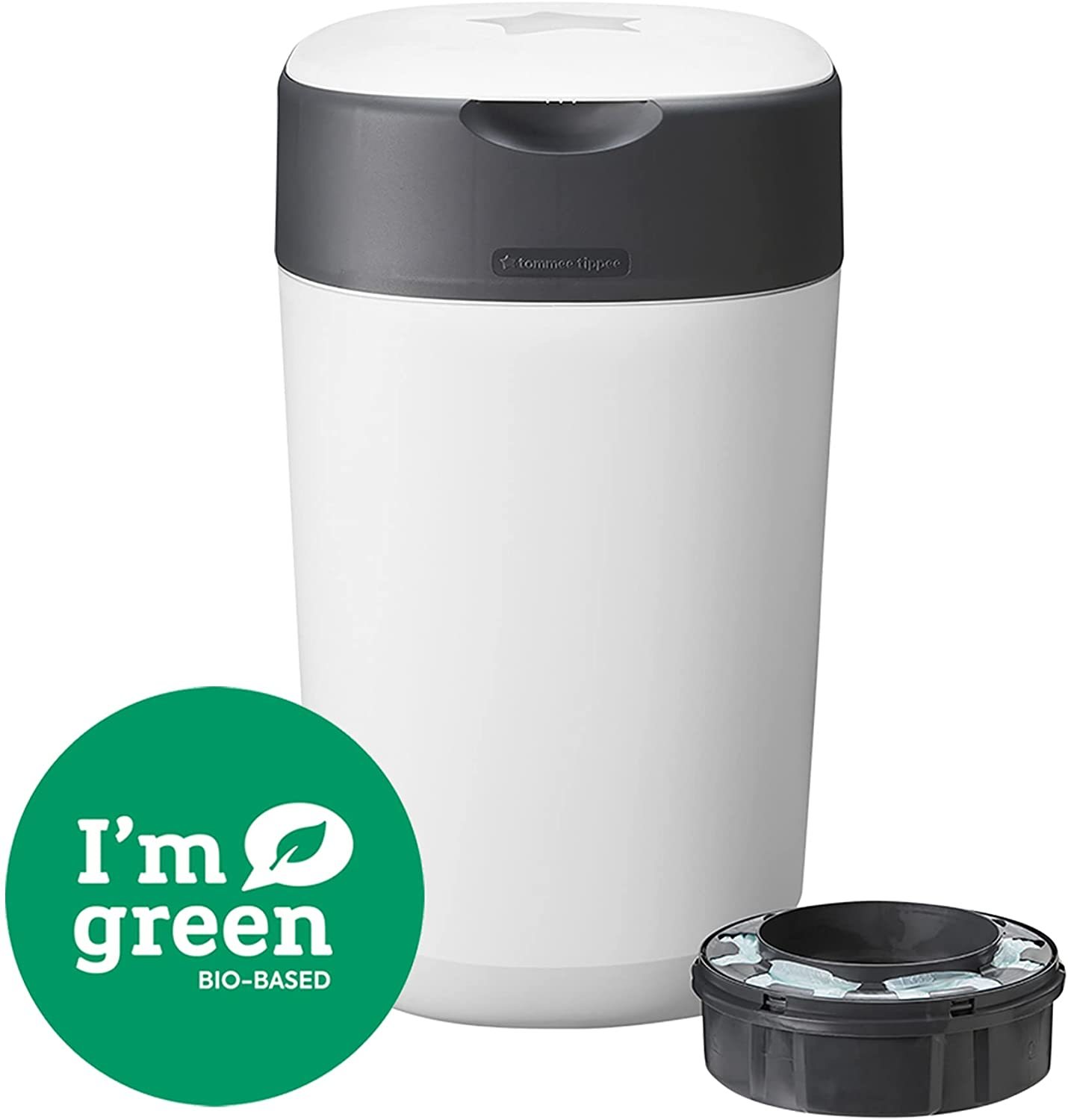 - Teraz więcej : kosze na pieluchy typu „przekręć i kliknij” oraz rama do napełniania są wykonane w 98% z tworzywa sztucznego pochodzącego z recyklingu i w pełni nadającego się do recyklingu, a teraz zawierają antybakteryjną folię z trzciny cukrowej pozyskiwaną w sposób zrównoważony