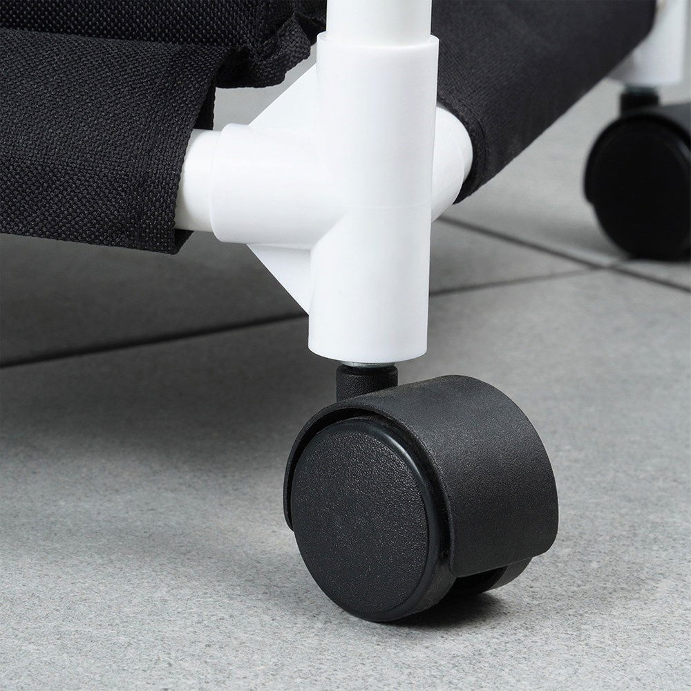 WYTRZYMAŁY - Stelaż kosza wykonany z najwyższej jakości tworzywa w białym kolorze a kółka w kolorze czarnym. Kosz tworzy tkanina poliestrowa w kolorze czarny,, która jest bardzo wytrzymała i sztywna, dzięki czemu po wrzuceniu prania utrzymuje swój kształt. Konstrukcja kosza jest stabilna i sztywna.