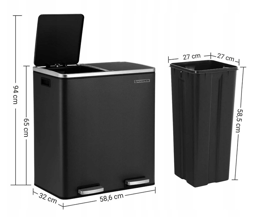 Kosz na Śmieci, Czarny, 74 x 64 x 42 cm Songmics LTB60BK POWYSTAWOWY