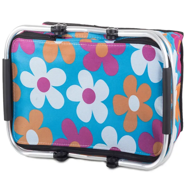 Kosz piknikowy niebieski w kwiaty składany turystyczny koszyk