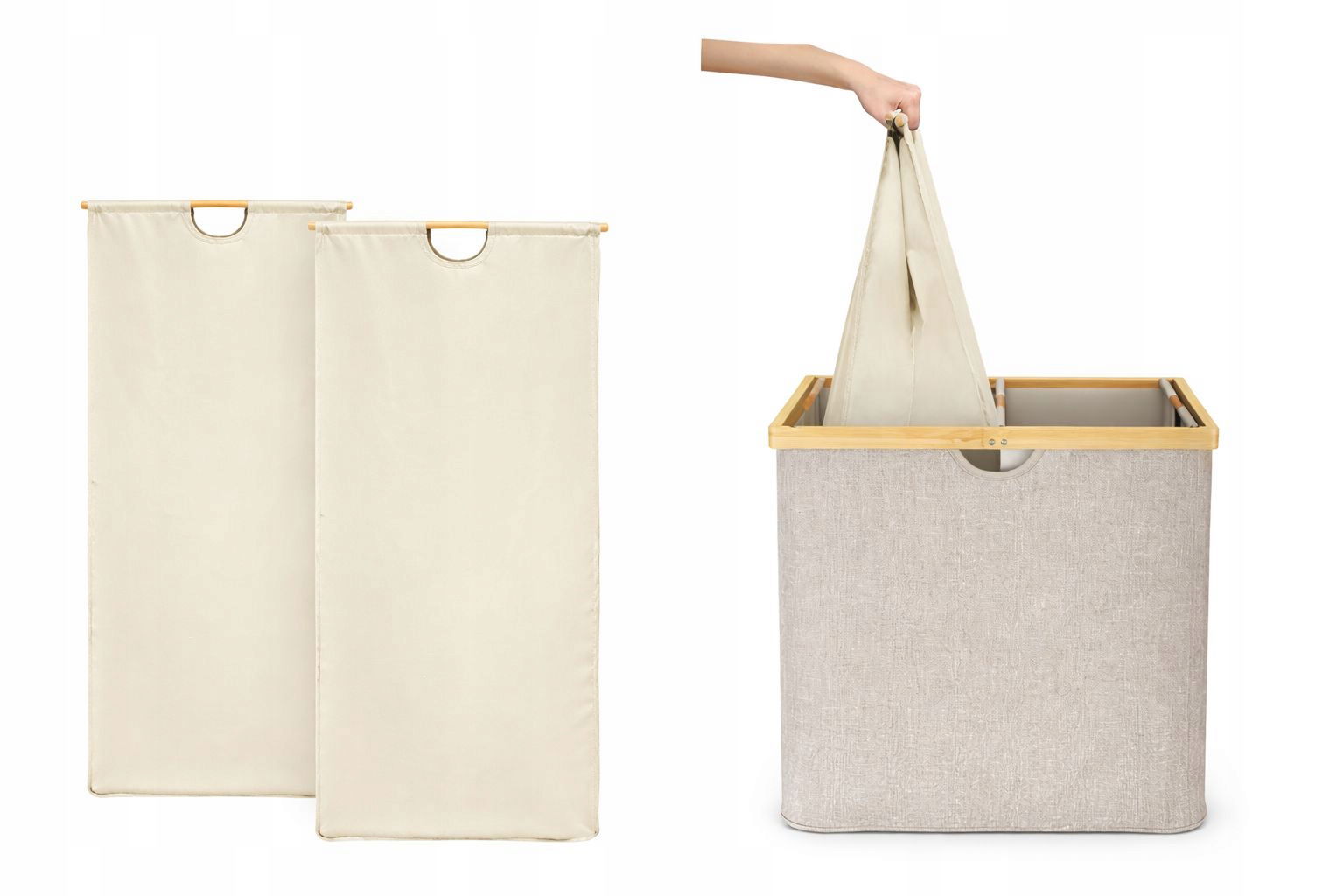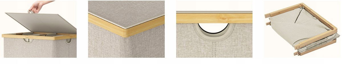 Trwały materiał - kosz na pranie posiada atrakcyjną bambusową ramę i wytrzymałą tkaninę kationową 300D, oferując idealne połączenie stylu i trwałości.