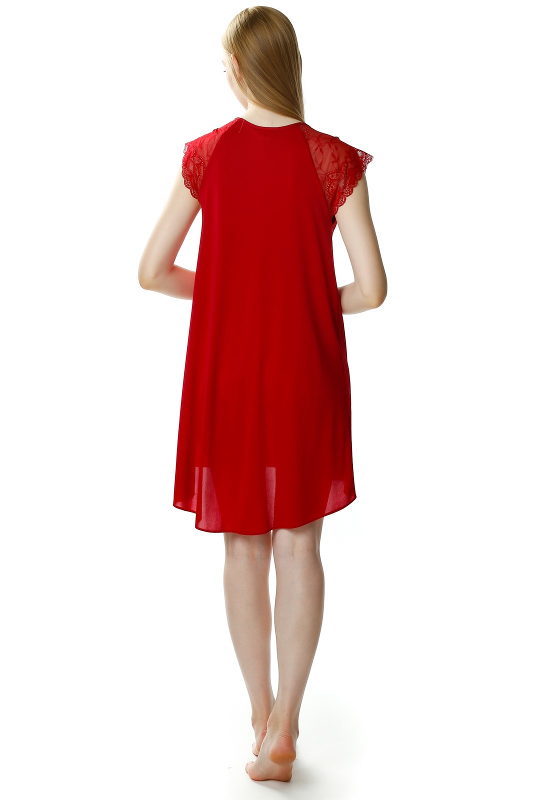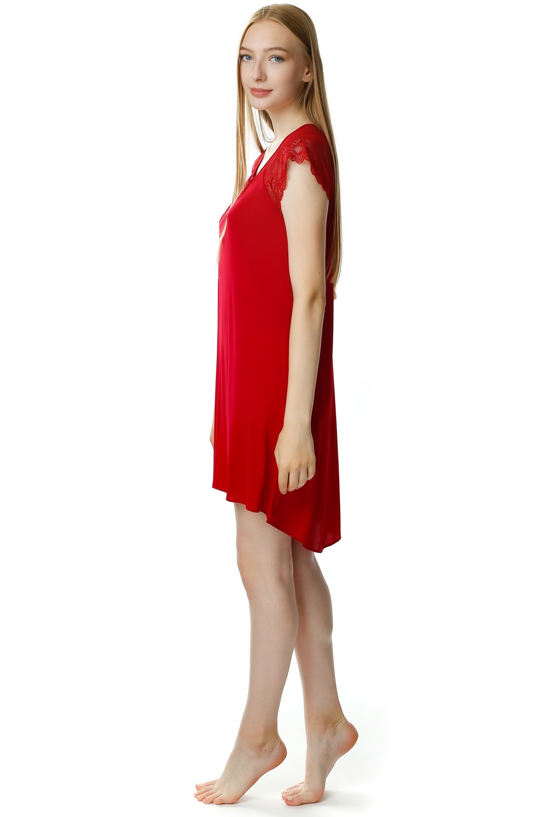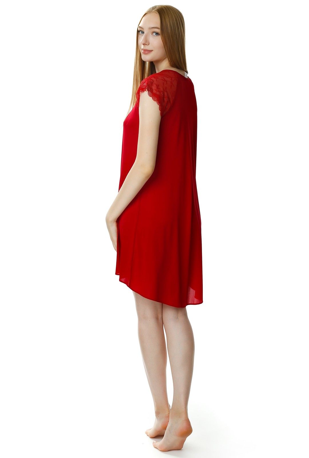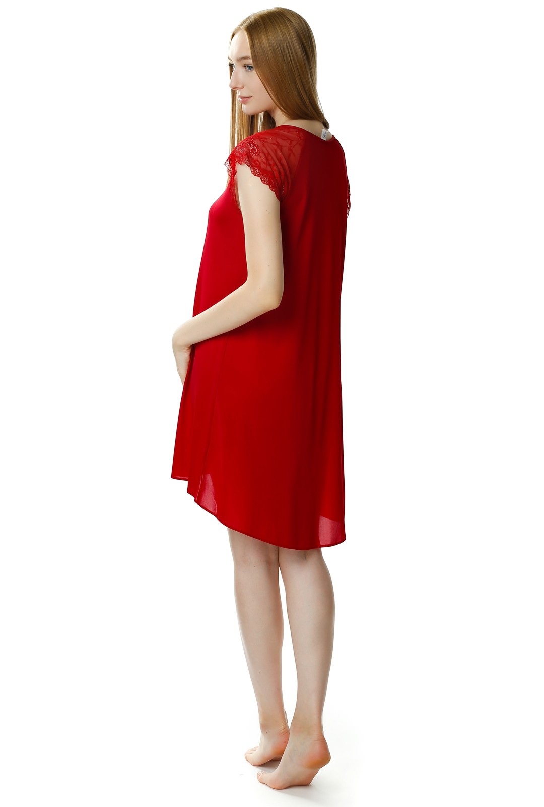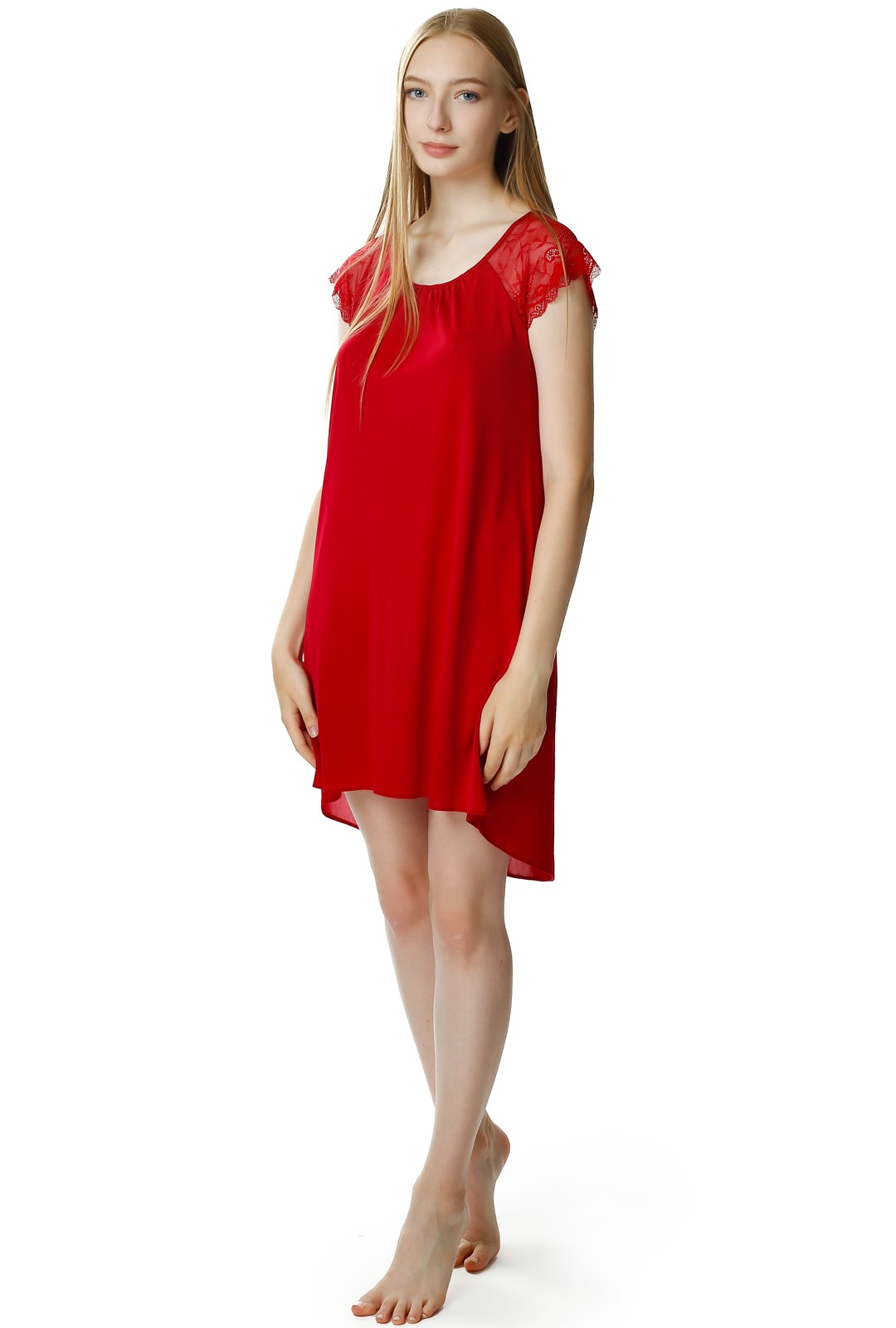 Koszula nocna ma asymetryczny krój, z przodu jest krótsza - do kolan, a tył dłuższa. Okrągły dekolt oraz koronkowe rękawki nadają jej delikatnego romantycznego looku. Całość wygląda niezwykle lekko i powabnie.