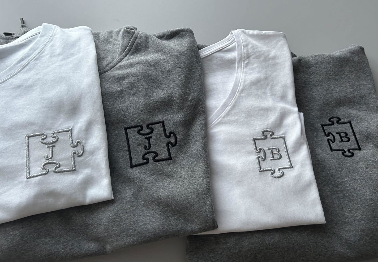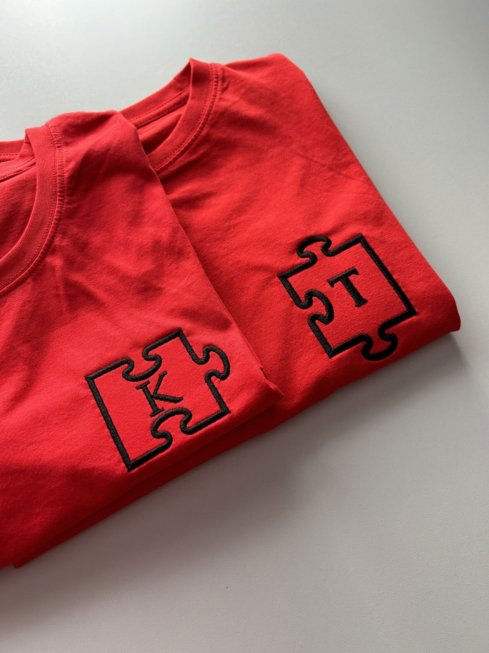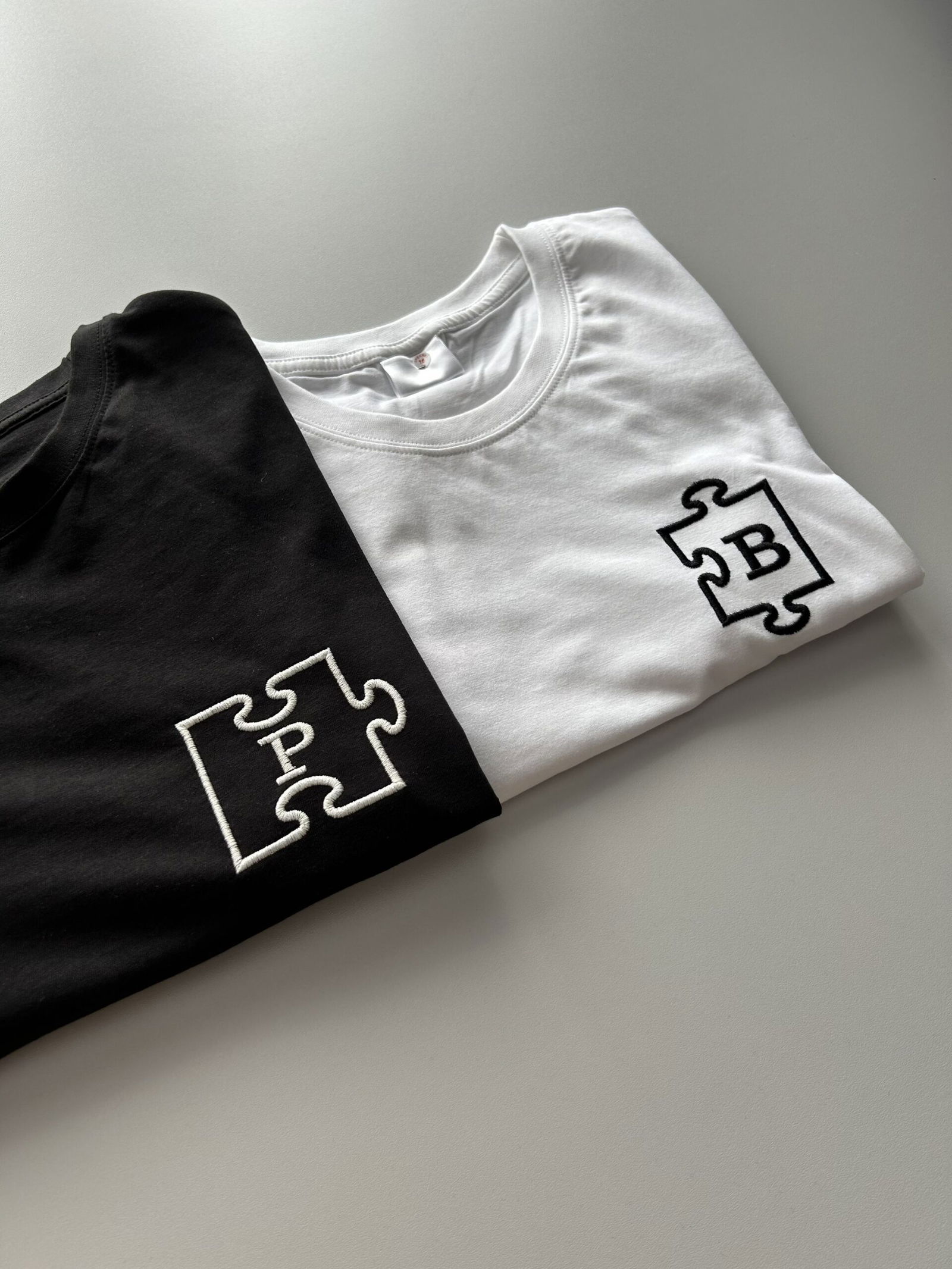 Koszulki dla par z wyhaftowanym puzzlem, a w nim inicjały: