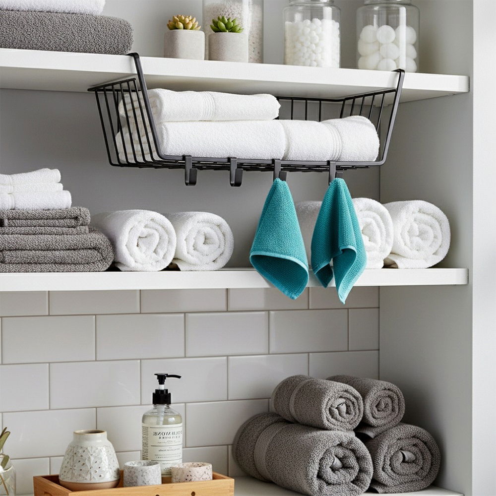 Koszyk podwieszany pod półkę, świetnie sprawdzi się do zorganizowania przestrzeni w szafce, ale również w szafie. Wystarczy go tylko podwiesić pod półkę. Wykorzystamy go w wielu pomieszczeniach zarówno w domu, jak i w biurze. Pozwoli nam wygodnie przechowywać najpotrzebniejsze akcesoria, wykorzystując maksymalnie przestrzeń.