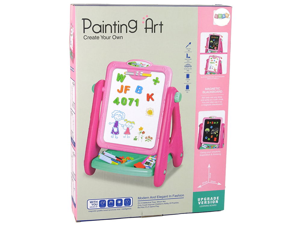 Zaprezentuję Ci niesamowitą tablicę edukacyjną 2w1 w kolorze niebieskim, która towarzyszy dzieciom w nauce i zabawie. Tablica ta oferuje dwie różne funkcje: jedna strona służy do malowania pisakami lub przypinania kartek, natomiast druga strona jest magnetyczna i umożliwia pisanie kredą. W zestawie znajdziesz tablicę z nóżkami, 5 kolorowych pisaków, praktyczną gąbkę do zmywania, 12 kolorowych kred do pisania oraz zestaw magnesów z literkami, cyferkami i znakami. Wymiary tablicy to 41 cm x 27 cm x 37 cm, a opakowania 48 cm x 35 cm x 8 cm. Ta tablica nie tylko zapewnia kreatywną zabawę, ale także wspomaga rozwój umiejętności dzieci, takich jak pisanie, rysowanie, liczenie i nauka liter. Doskonały prezent dla małych odkrywców, którzy uczą się w sposób interaktywny i atrakcyjny. Produkt posiada certyfikat CE i spełnia normę EN71. Przeznaczony dla dzieci powyżej 3 roku życia.