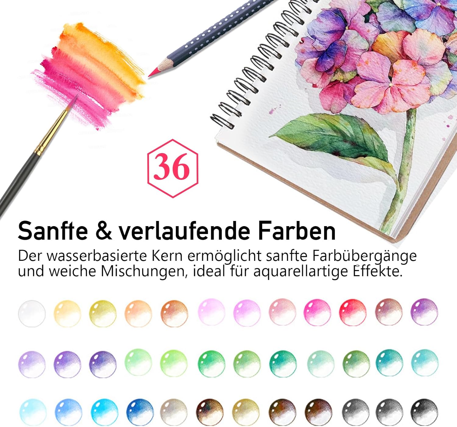 Kredki akwarelowe – 36 rozpuszczalnych w wodzie kredek, rozpuszczalne w wodzie kredki dla dzieci i dorosłych, na bazie wody, delikatne kolory, z puszką i cienkim pędzelkiem, 36 sztuk
