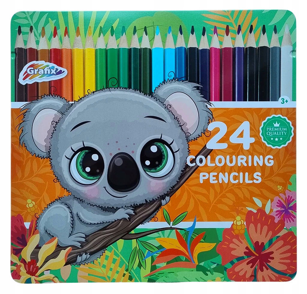 Kredki ołówkowe kolorowe 24 szt metalowy box szkolne Grafix wzór KOALA