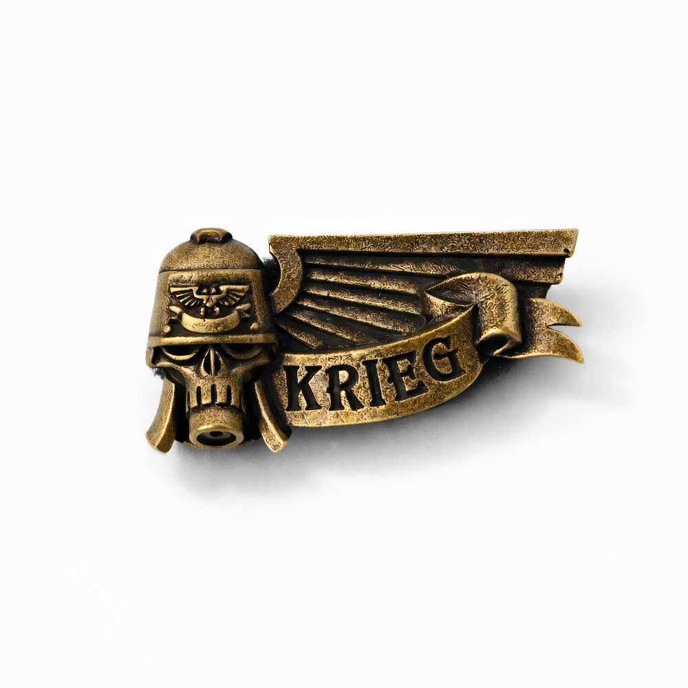 W niekończących się wojnach okopowych 41. tysiąclecia „Krieg” to nie tylko miejsce — to obietnica obowiązku, wytrwałości i żelaznej determinacji, a ten pin Krieg przenosi ten klimat prosto na Twój codzienny outfit. Przy 5 cm jest kompaktowy, ale od razu rozpoznawalny, wykończony w postarzaną, mosiężną tonację z mocno przyciemnionymi zagłębieniami, dzięki czemu wypukły relief wygląda jak relikt wyciągnięty ze skrzyni po kampanii. W centrum widać czaszkowatą maskę gazową pod kopułowym hełmem, z małym skrzydlatym emblematem na czole i wyraźnym detalem respiratora — dokładnie ten „oblężniczy” zarys, który kojarzy się z wojskami z Krieg. Za hełmem rozchodzą się warstwowe skrzydła o ostrych, schodkowych przetłoczeniach, dodając całości dynamiki i ciężaru, a z przodu przewija się gruby zwój z napisem „KRIEG” w kontrastowych literach. Powierzchnia jest celowo surowa i „zaharowana” — chropowata, postarzana faktura pięknie łapie światło i nawiązuje do klasycznej estetyki z kodeksów oraz imperialnych insygniów. Metalowa konstrukcja daje solidne wrażenie w dłoni, a pojedynczy bolec i błyszczące zapięcie motylkowe pozwalają łatwo przypiąć pin do klapy kurtki, paska plecaka, ita baga albo tablicy kolekcjonerskiej. Jeśli chcesz mieć przy sobie znak miłości do twardego, imperialnego klimatu i legendy Death Korps, ten pin jest gotowy do akcji.