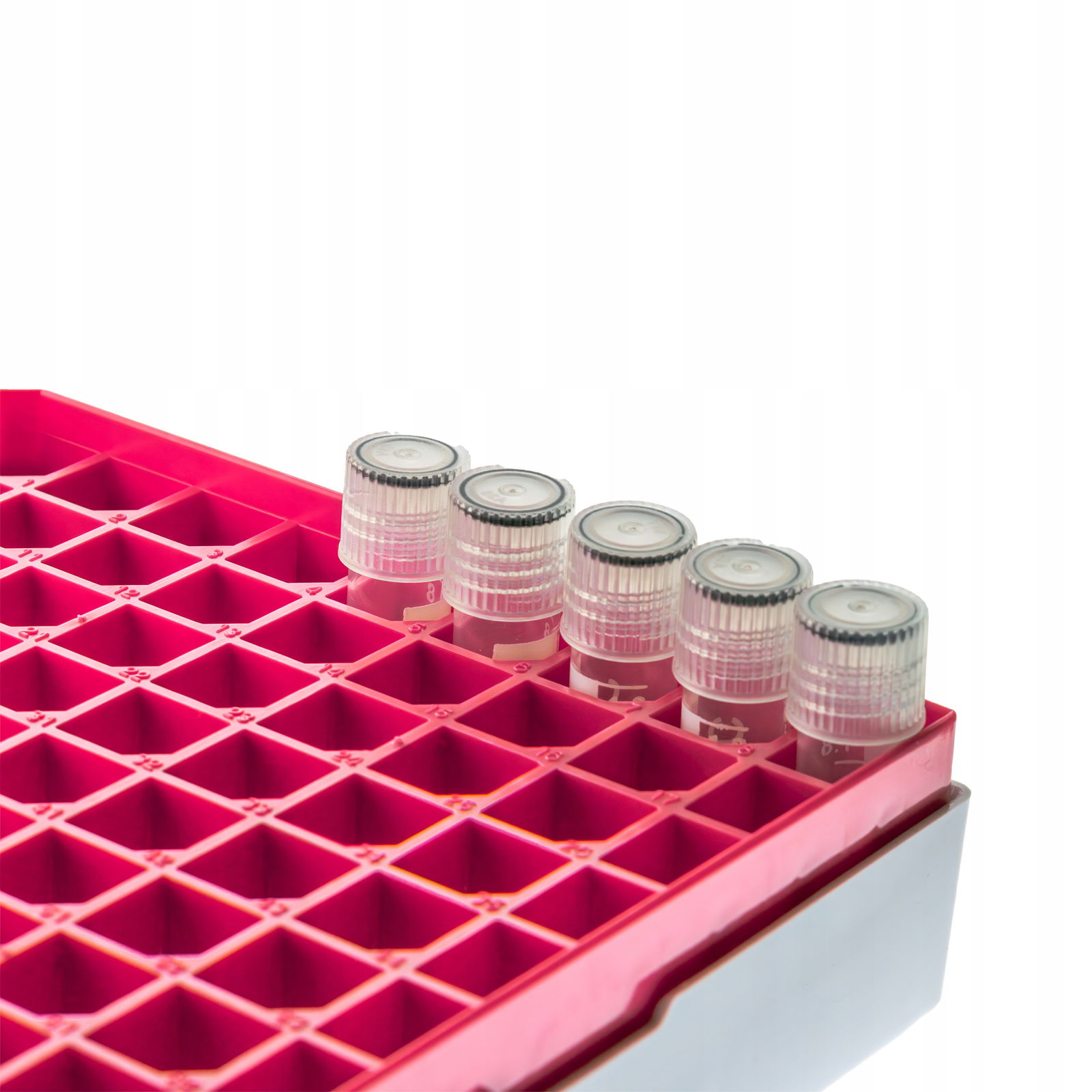 Kriopudełko statyw na probówki fiolki 9x9 81 miejsc poliwęglan różowy