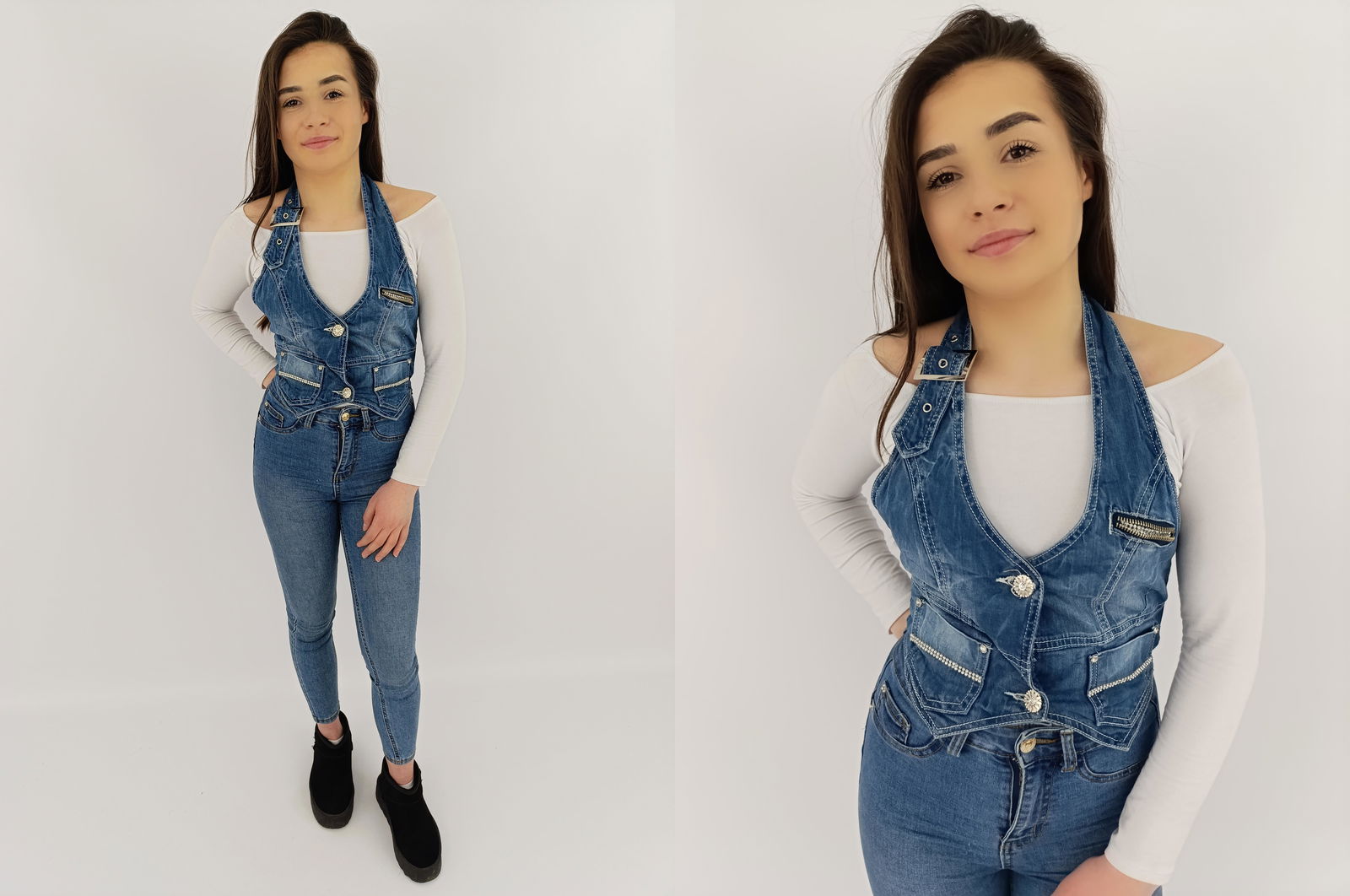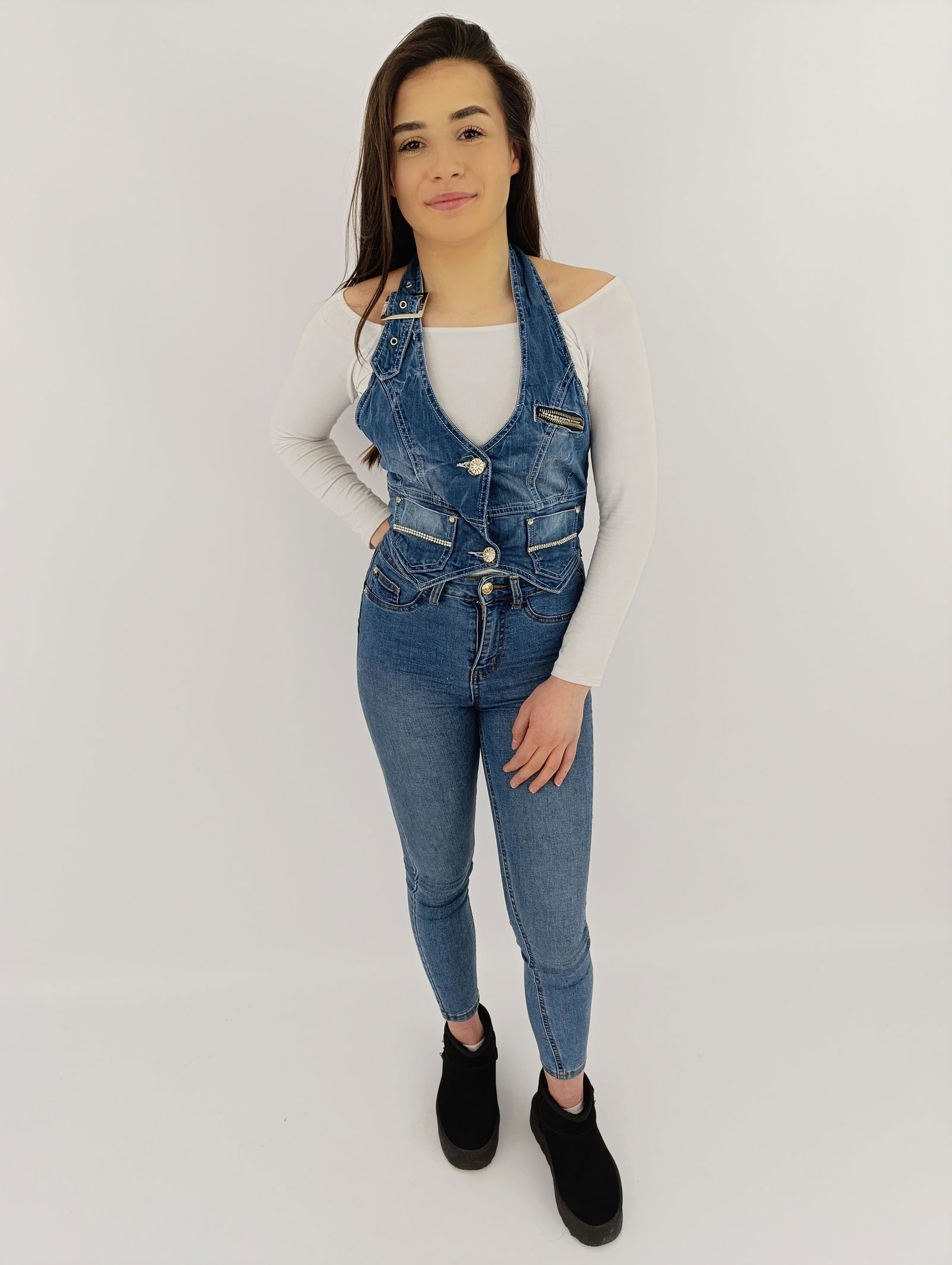 Modna kamizelka damska z cyrkoniami, wykonana z jeansu, idealna na każdą okazję. Bawełniany materiał gwarantuje wygodę i komfort noszenia.