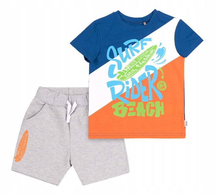 Dwuczęściowy komplet chłopięcy . Stylowy zestaw dla chłopca z lekkich i wygodnych materiałów, zwiększających komfort podczas użytkowania. W skład kompletu wchodzą spodenki z wiązaniem w pasie dla lepszego dopasowania oraz koszulka . Krój nie ogranicza ruchów podczas zabawy oraz codziennych czynności. Oryginalny nadruk. Materiał - bawełna