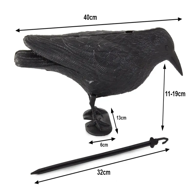 Figura jest bardzo trwała, została wykonana z wysokiej jakości tworzywa sztucznego, odpornego na zmienne warunki atmosferyczne. Atrapa kruka jest naturalnych wymiarów co stanowi wizualną obawę i zagrożenie dla innych ptaków i gryzoni.