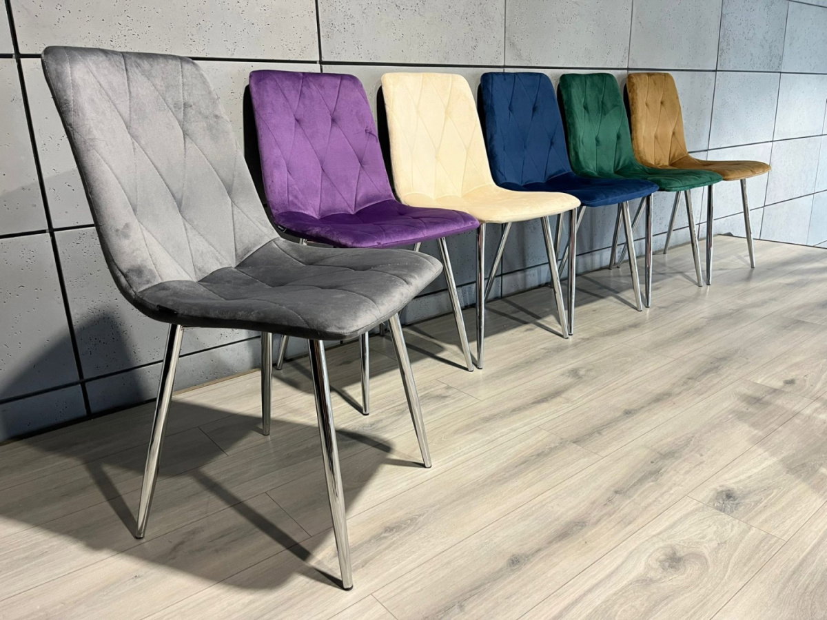 Nowoczesne krzesła tapicerowane welurem z przeszyciami w romby na srebrnych nogach.
