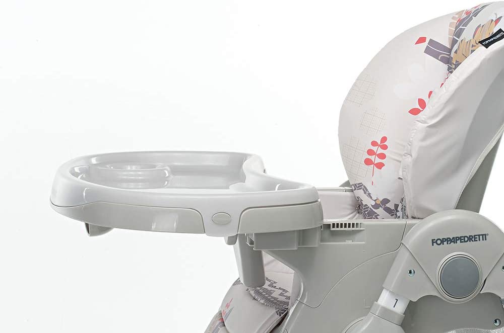 Krzesełko do karmienia Foppapedretti - wielofunkcyjne regulowanie wysokości, natomiast podnóżek i taca krzesełka może zająć trzy różne pozycje. Krzesełko posiada również pięciopunktowe pasy bezpieczeństwa.