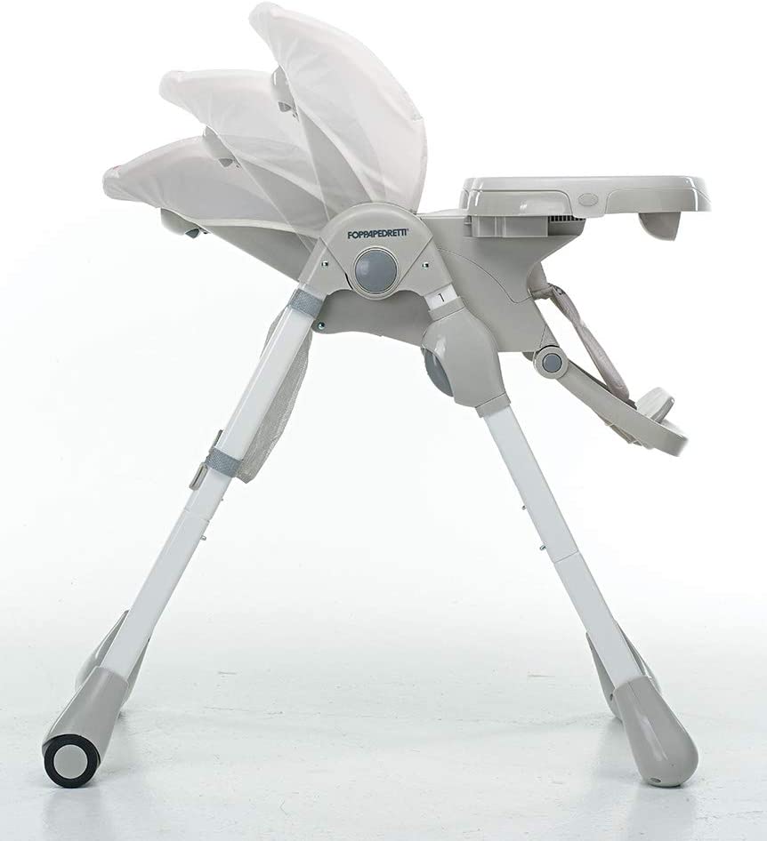 Na początku krzesełko do karmienia Foppapedretti może służyć jako leżaczek podczas karmienia niemowlaka. Następnie regulacja siedziska pozwala nam na ustawienie odpowiednio oparcia krzesełka, aby mogło ono służyć zarówno do posiłków jak i służyło nam do spędzania wolnego czasu na grach i zabawach. Krzesełko posiada metalową ramę, pozostałe części wózka zbudowane są z tworzyw sztucznych.