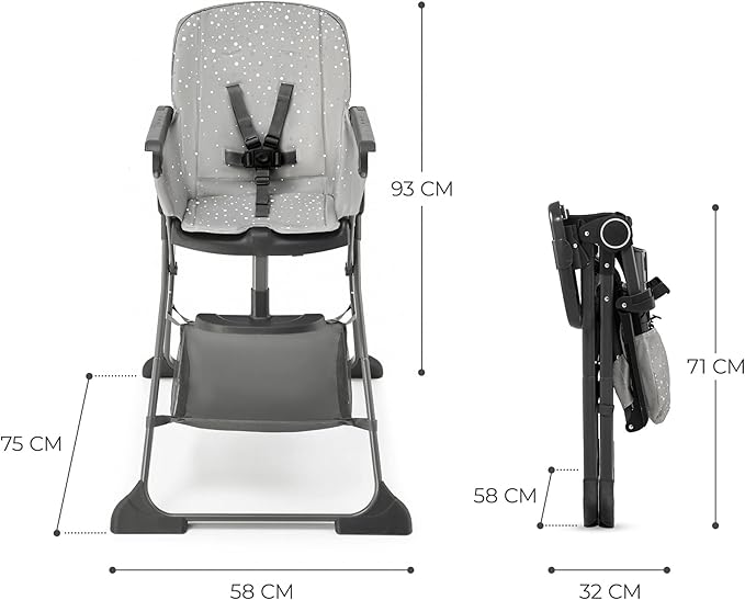 FOLDEE ma duże siedzisko, które wykonano z łatwego w czyszczeniu materiału. Z łatwością usuniesz z niego nawet najbardziej uciążliwe plamy po posiłku. Krzesełko jest bezpieczne: ma 5-punktowe, regulowane pasy, które w razie potrzeby zdejmiesz i wypierzesz. Pod siedziskiem znajduje się kosz na drobiazgi - np. na mokre chusteczki czy zapasowy śliniaczek.