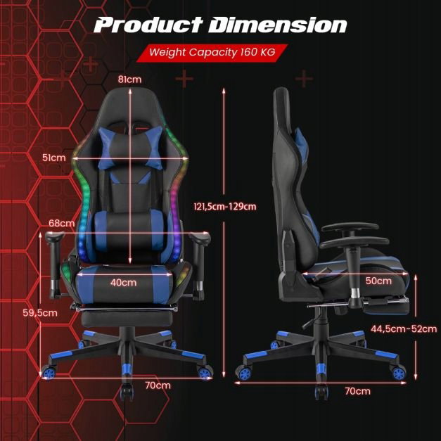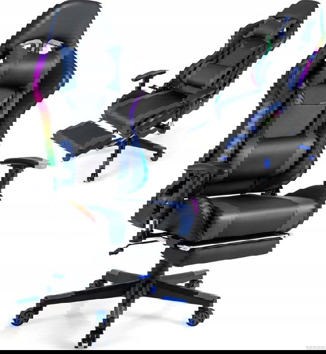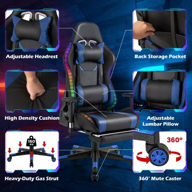 Ten fotel do gier jest wyposażony w światła LED RGB na oparciu i krawędzi siedziska, które tworzą fantazyjną atmosferę gry. Światła są zasilane za pomocą kabla USB i można je łatwo obsługiwać za pomocą pilota zdalnego sterowania. Aby zaspokoić różne potrzeby, ten fotel komputerowy ma regulowaną wysokość siedziska, regulowane oparcie, regulowany podłokietnik i chowany podnóżek. Ponadto siedzisko można obracać o 360°, a uniwersalne kółka ułatwiają przemieszczanie fotela.