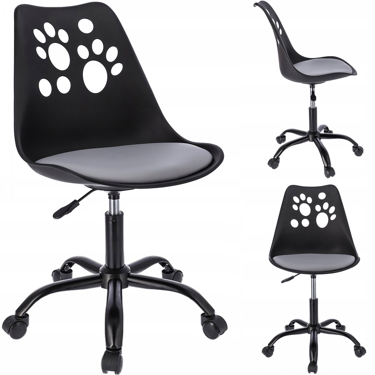 ➡️ Idealnie wyprofilowane oparcie z motywem psich łapek w połączeniu z miękką poduszką umieszczoną na siedzisku zapewnia wygodę, a pięcioramienna podstawa zakończona niewielkimi kółkami daje dużą stabilność oraz zabezpiecza powierzchnię przed zarysowaniem. Krzesło posiada siłownik, który pozwala dostosować wysokość siedzenia do wymaganych potrzeb.