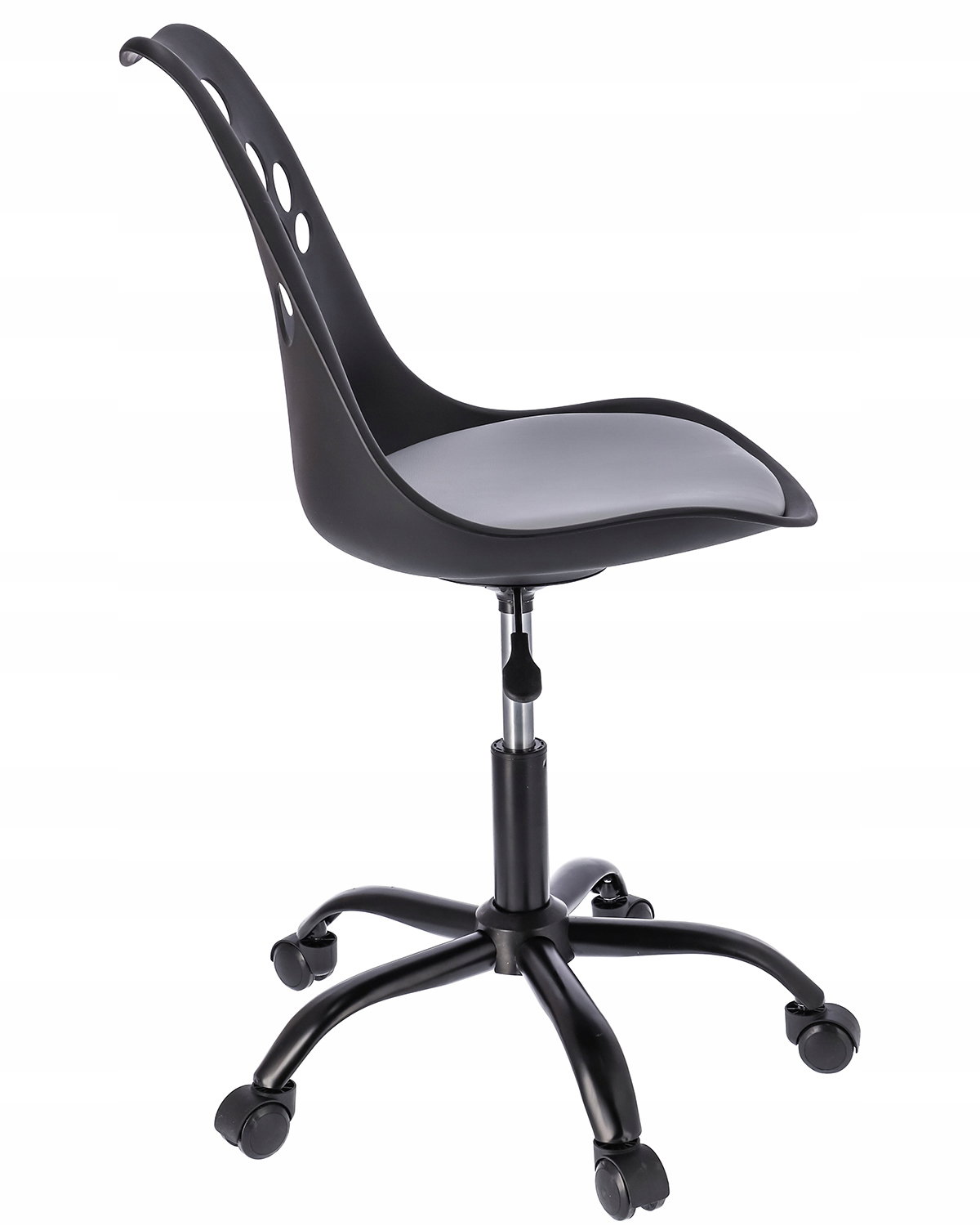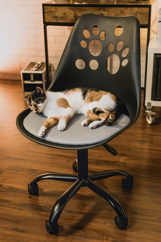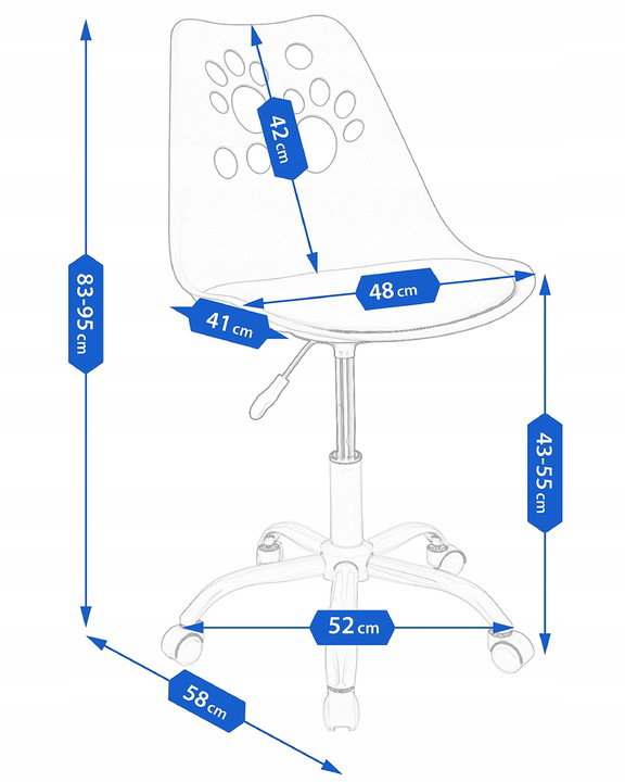 Idealnie wyprofilowane oparcie z motywem psich łapek w połączeniu z miękką poduszką umieszczoną na siedzisku zapewnia wygodę, a pięcioramienna podstawa zakończona niewielkimi kółkami daje dużą stabilność oraz zabezpiecza powierzchnię przed zarysowaniem. Krzesło posiada siłownik, który pozwala dostosować wysokość siedzenia do wymaganych potrzeb.