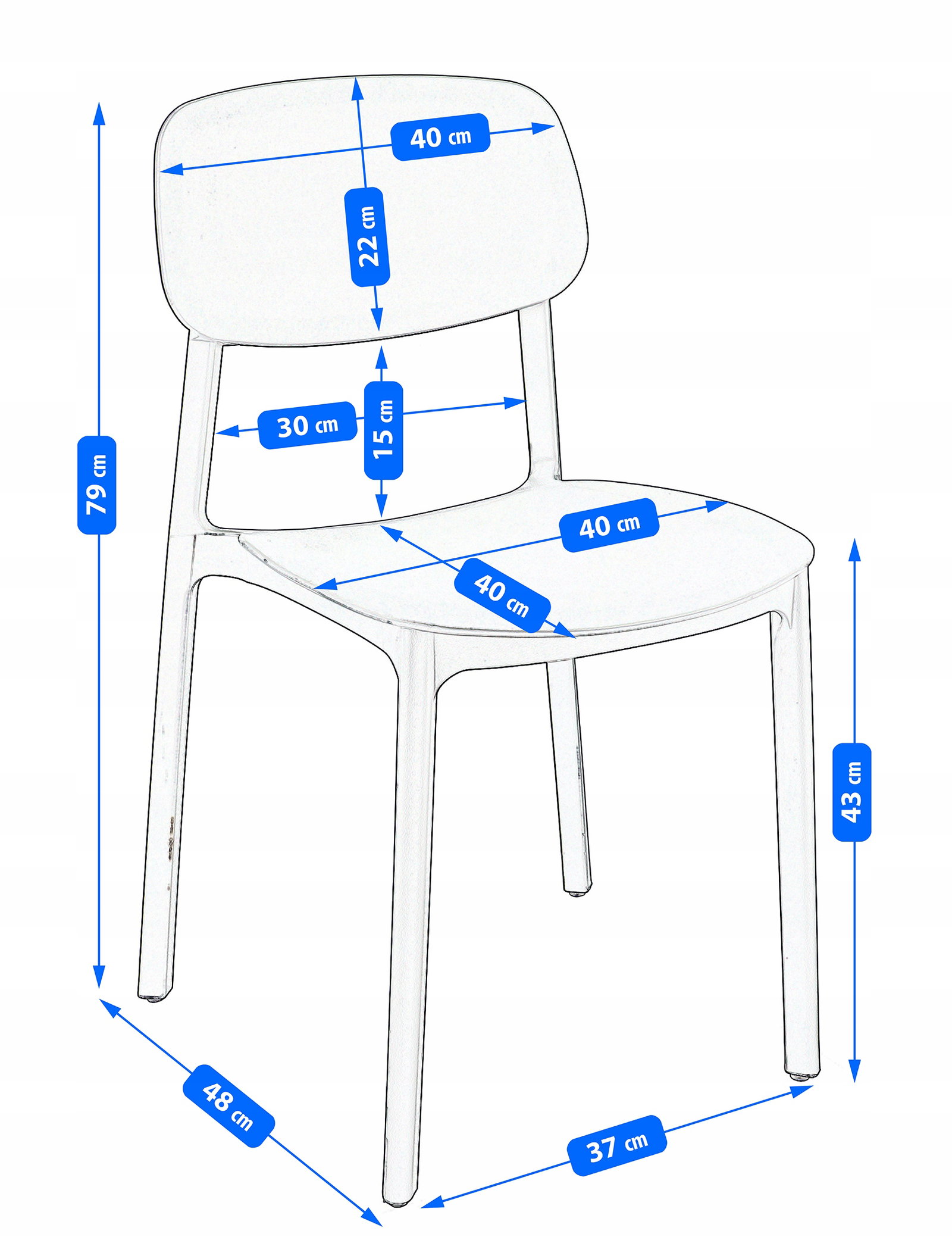 Specyfikacja: Materiał: polipropylen Maksymalne obciążenie: 120 kg Wymiary: Wysokość mebla: 79 cm Szerokość mebla: 40 cm Głębokość mebla: 48 cm Wysokość siedziska: 43 cm Szerokość siedziska: 40 cm Głębokość siedziska: 40 cm