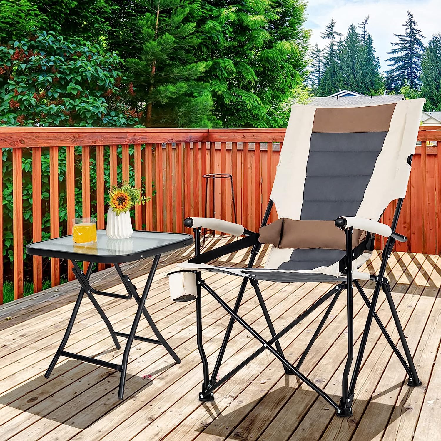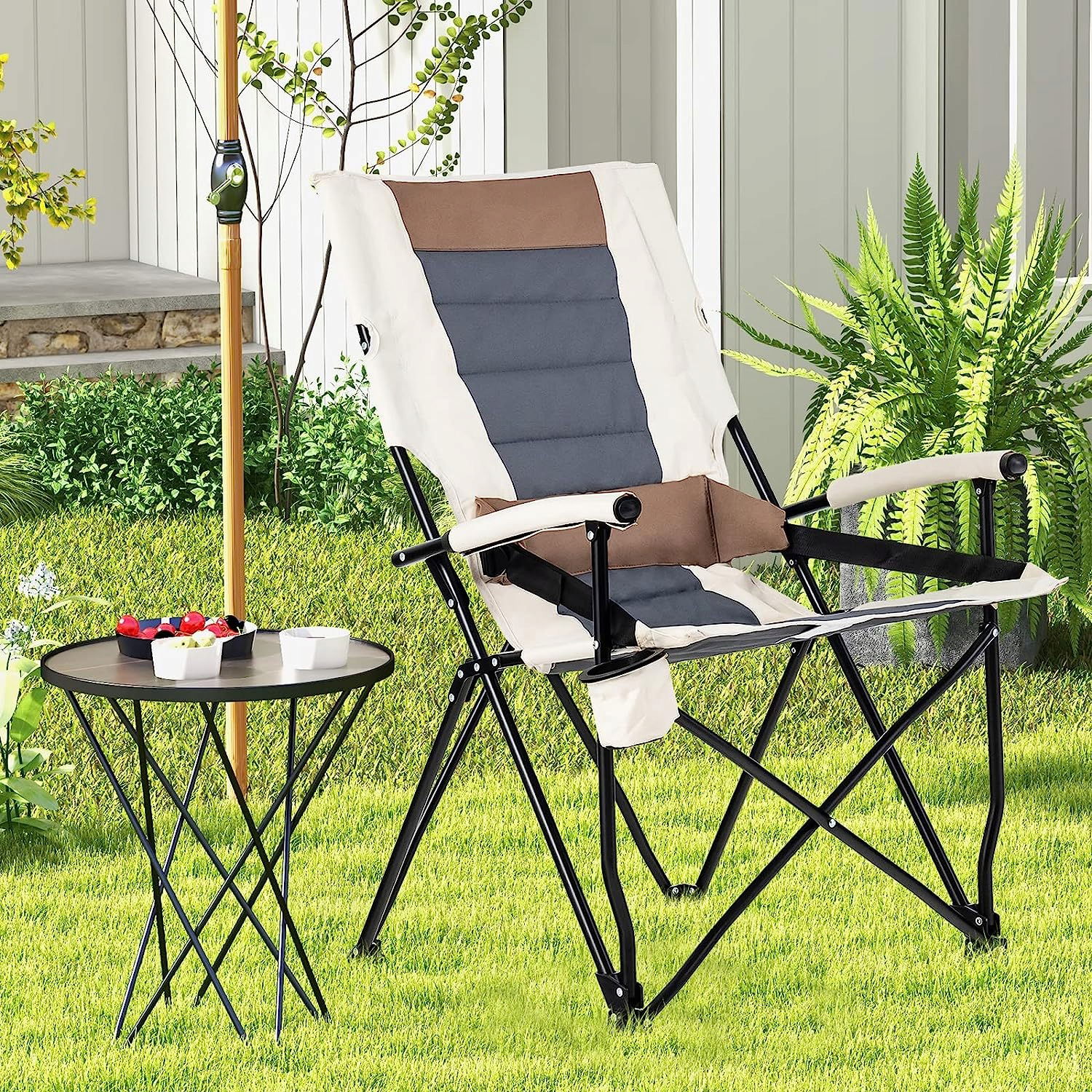 Przemyślane szczegóły: wyposażony w uchwyt na kubek z boku tego krzesła, który jest wygodny do umieszczenia napoju lub kubka podczas biwakowania. Co więcej, cztery antypoślizgowe podkładki pod stopy mogą zapewnić stabilność krzesła ogrodowego, a owinięte podłokietniki zapewniają wsparcie dla ramion.