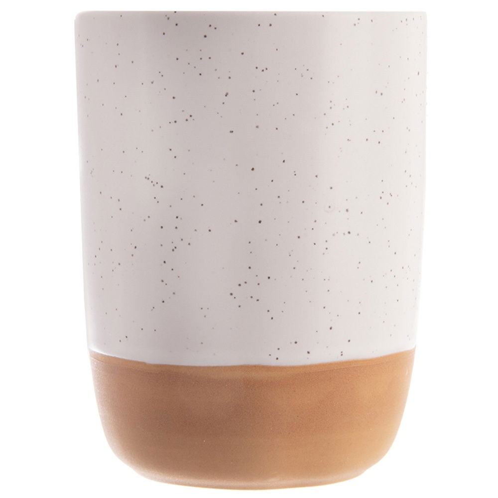 Wykonany z ceramiki - Wykonany z najwyższej jakości ceramiki w białym kolorze z nakrapianą powierzchnią. Dolna część kubka wykończona kamionką. Kubek będzie pięknie prezentować się na stole.