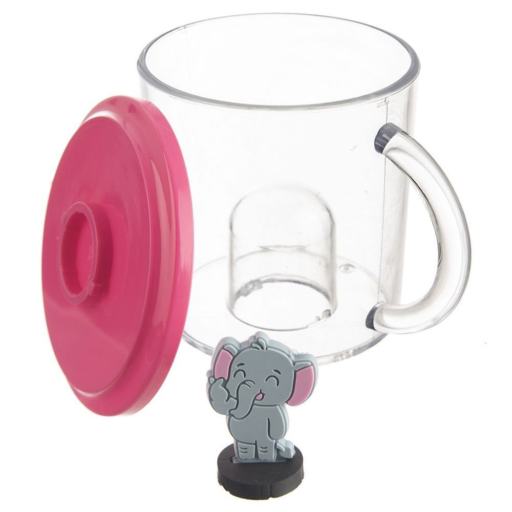 DZIECIĘCY - Pokrywka wyposażona jest w figurkę słonia, którą można zdjąć i może służyć dzieciom do zabawy. Dzięki przezroczystej formie kubka, dziecko będzie widziało napoje umieszczone w kubku, co zachęci je do spożywania napojów. Kubek przeznaczony dla dzieci od 3 roku życia. Nie zawiera BPA.