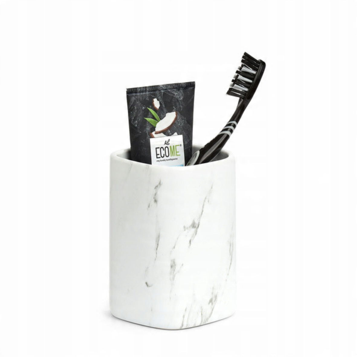 Dodaj elegancji swojej łazience dzięki biało-czarnemu pojemnikowi na szczoteczki do zębów z marmurowym wzorem. Wykonany z solidnego tworzywa sztucznego, łączy trwałość z wyjątkowym designem inspirowanym luksusowym marmurem.