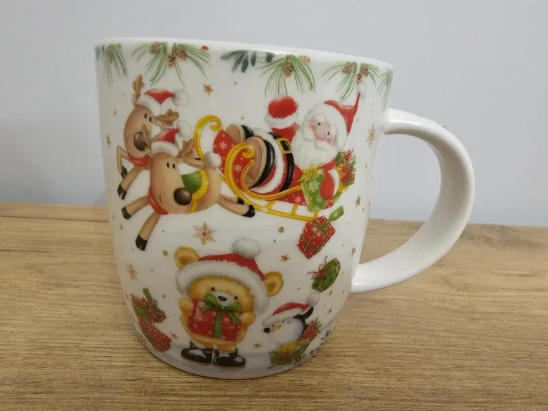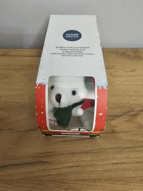 Kubek porcelanowy, świąteczny z maskotką w opakowaniu prezentowym.Kubek jest nowy.