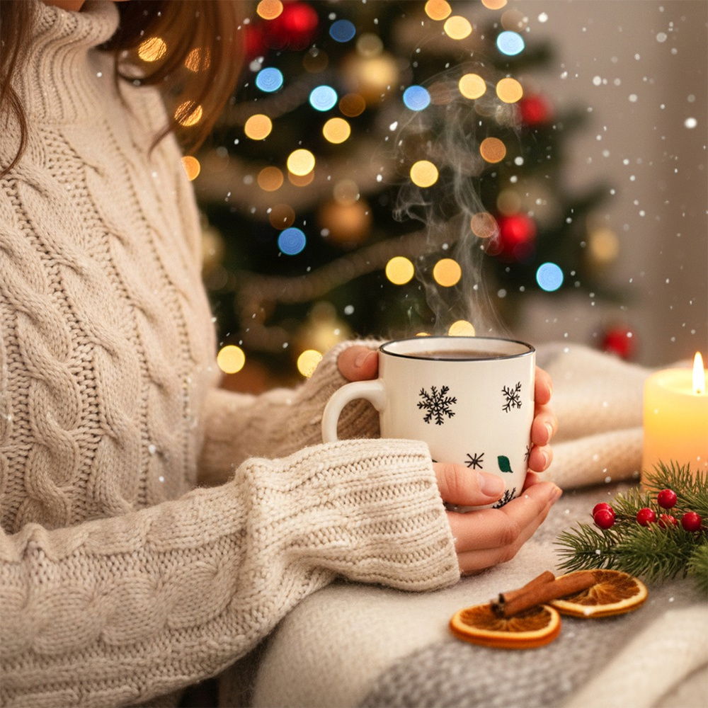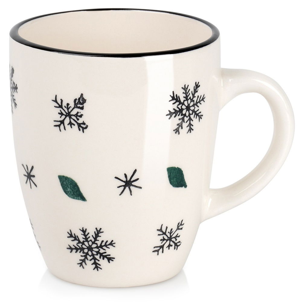 Wykonany z ceramiki - Kubek wykonany jest z najwyższej jakości ceramiki w białym kolorze. Kubek posiada kolorowy wzór z motywem śnieżynek. Dodatkowym akcentem jest czarny rant na górnej krawędzi, który pięknie podkreśla świąteczny charakter kubka.
