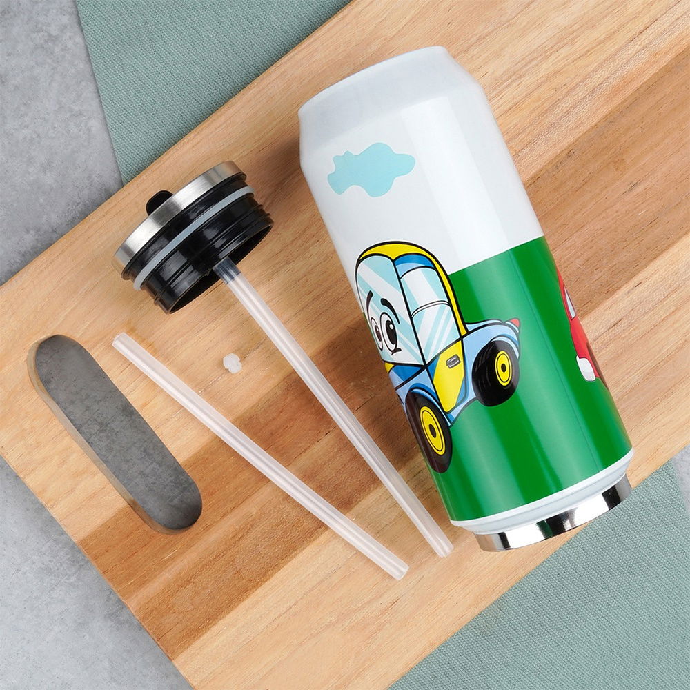 Kubek termiczny w kształcie puszki. Posiada efektowny motyw autek. Wyposażony w ustnik, który umożliwi picie z termosu bez konieczności przechylania go. Idealny do picia napojów ciepłych oraz zimnych. Dzięki termicznym właściwościom pozwoli na utrzymanie ciepła lub zimna wlanego napoju. Sugerowane napełnienie kubka do maksymalnie 90% pojemności, w celu spełnienia funkcji podtrzymania temperatury. Przed napełnieniem termosu właściwym napojem najlepiej wlać gorącą lub zimną wodę (w zależności od potrzeby) pozostawić na 5 minut i wylać, dzięki temu zabiegowi temperatura dłużej zostanie podtrzymywana. Idealny pomysł na prezent. Sprawdzi się podczas podróży, wycieczek, ale również podczas codziennego użytkowania.