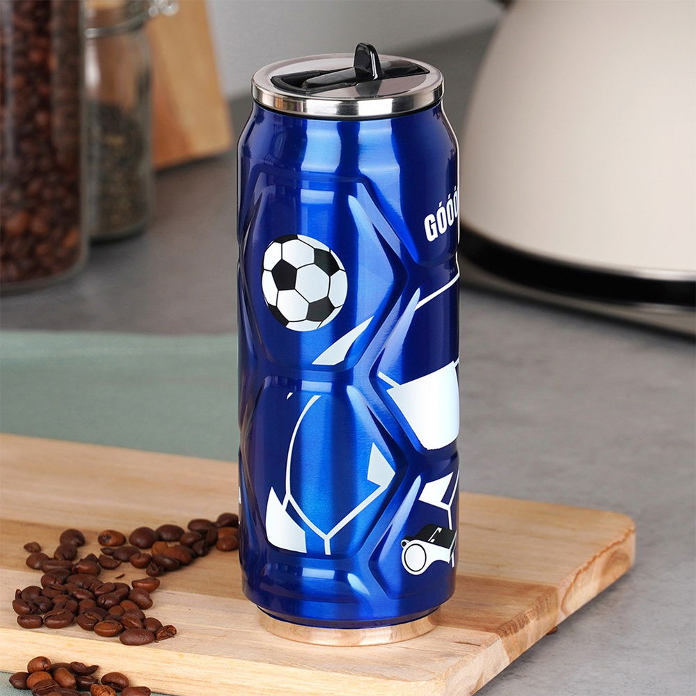 Kubek termiczny w kształcie puszki. Posiada efektowny motyw piłki nożnej. Wyposażony w ustnik, który umożliwi picie z termosu bez konieczności przechylania go. Idealny do picia napojów ciepłych oraz zimnych. Dzięki termicznym właściwościom pozwoli na utrzymanie ciepła lub zimna wlanego napoju. Sugerowane napełnienie kubka do maksymalnie 90% pojemności, w celu spełnienia funkcji podtrzymania temperatury. Przed napełnieniem termosu właściwym napojem najlepiej wlać gorącą lub zimną wodę (w zależności od potrzeby) pozostawić na 5 minut i wylać, dzięki temu zabiegowi temperatura dłużej zostanie podtrzymywana. Idealny pomysł na prezent. Sprawdzi się podczas podróży, wycieczek, ale również podczas codziennego użytkowania.