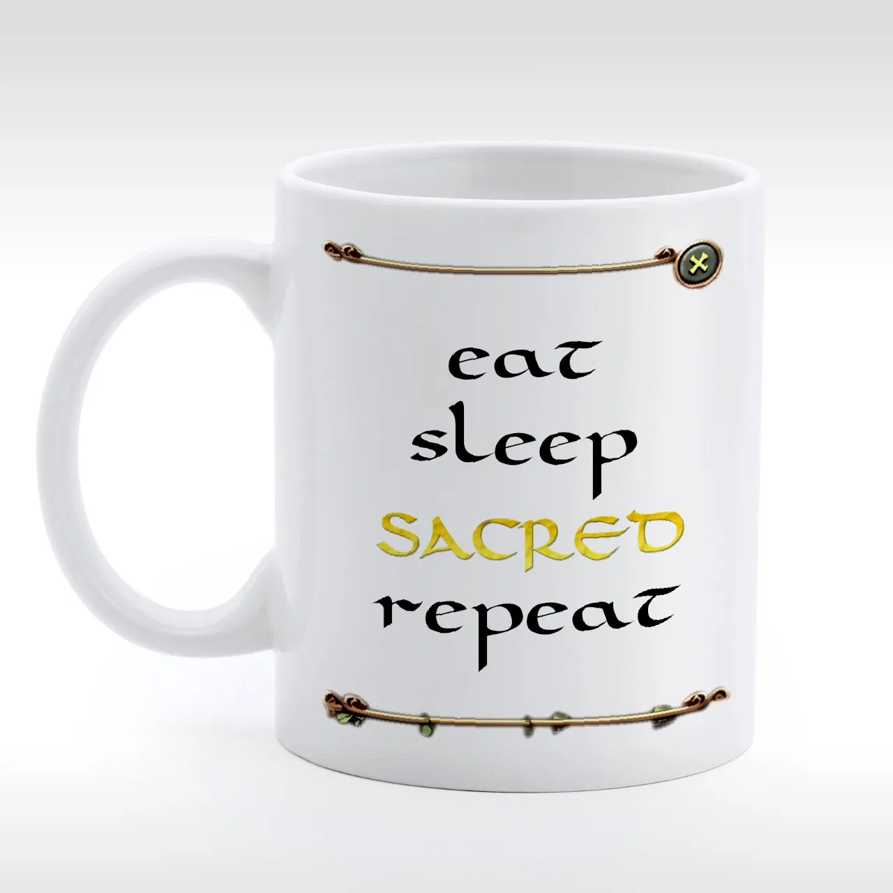 Po przeciwnej stronie kubka widnieje napis - "eat, sleep, sacred, repeat" okalony grafiką z interfejsu z gry Sacred.