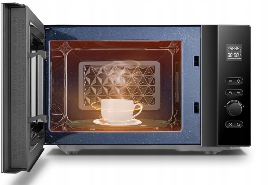 Urządzenie oferuje moc mikrofalową 800 W, co sprawia, że jest wystarczająca do codziennego podgrzewania, gotowania, a także rozmrażania żywności.