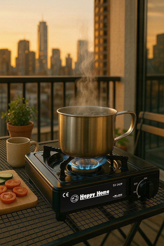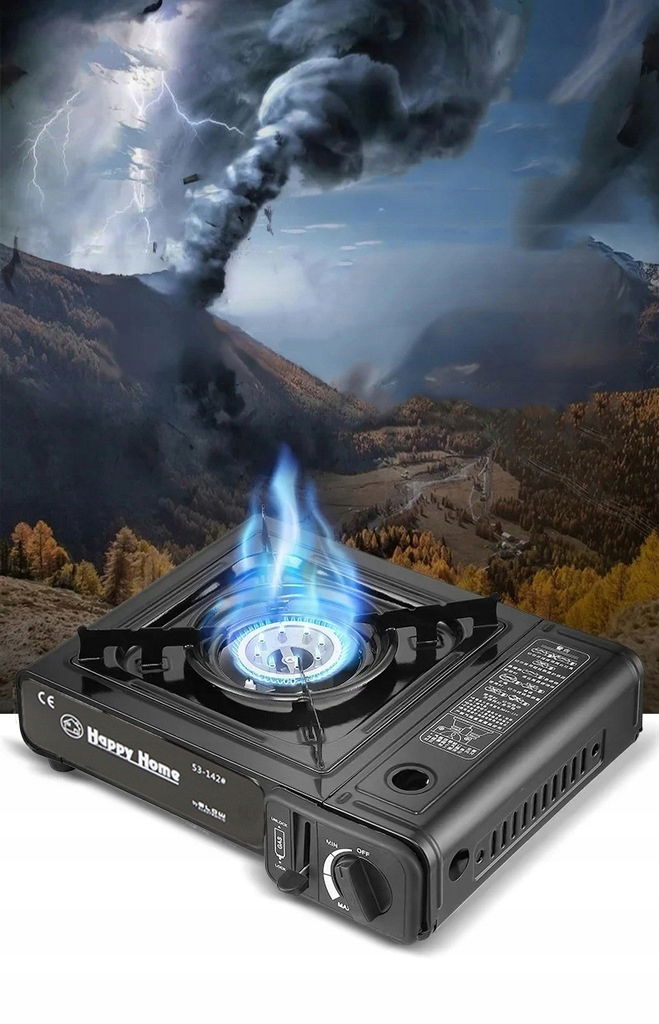 Kuchenka gazowa o mocy 2200W, zasilana standardowymi kartuszami gazowymi lub butlą gazową (przejściówka w zestawie). W łatwy sposób można podłączyć kartusz, a następnie wymienić go po zużyciu na nowy. Kuchenka posiada wbudowany automatyczny zapalnik piezoelektryczny, do jej odpalenia nie są potrzebne zapałki ani zapalniczka. Dodatkowo posiada pokrętło regulacji płomienia oraz suwak z regulacją dopływu gazu.