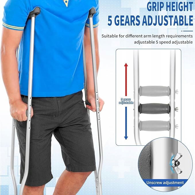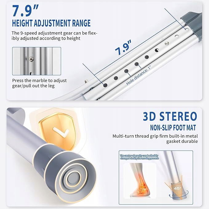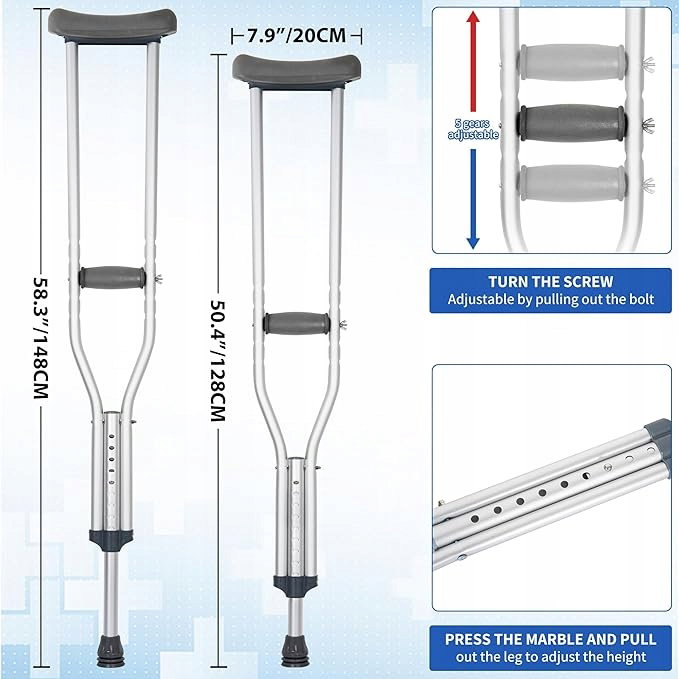 Regulacja wysokości: Kule są przeznaczone dla osób o wzroście od 175 cm do 195 cm, aby pomóc w urazach kostek, kolan i nóg oraz umożliwić chodzenie z mniejszym obciążeniem na uszkodzoną część ciała. Regulacja wysokości za pomocą jednego przycisku ułatwia regulację wysokości od 128 cm do 148 cm z 9 ustawieniami.