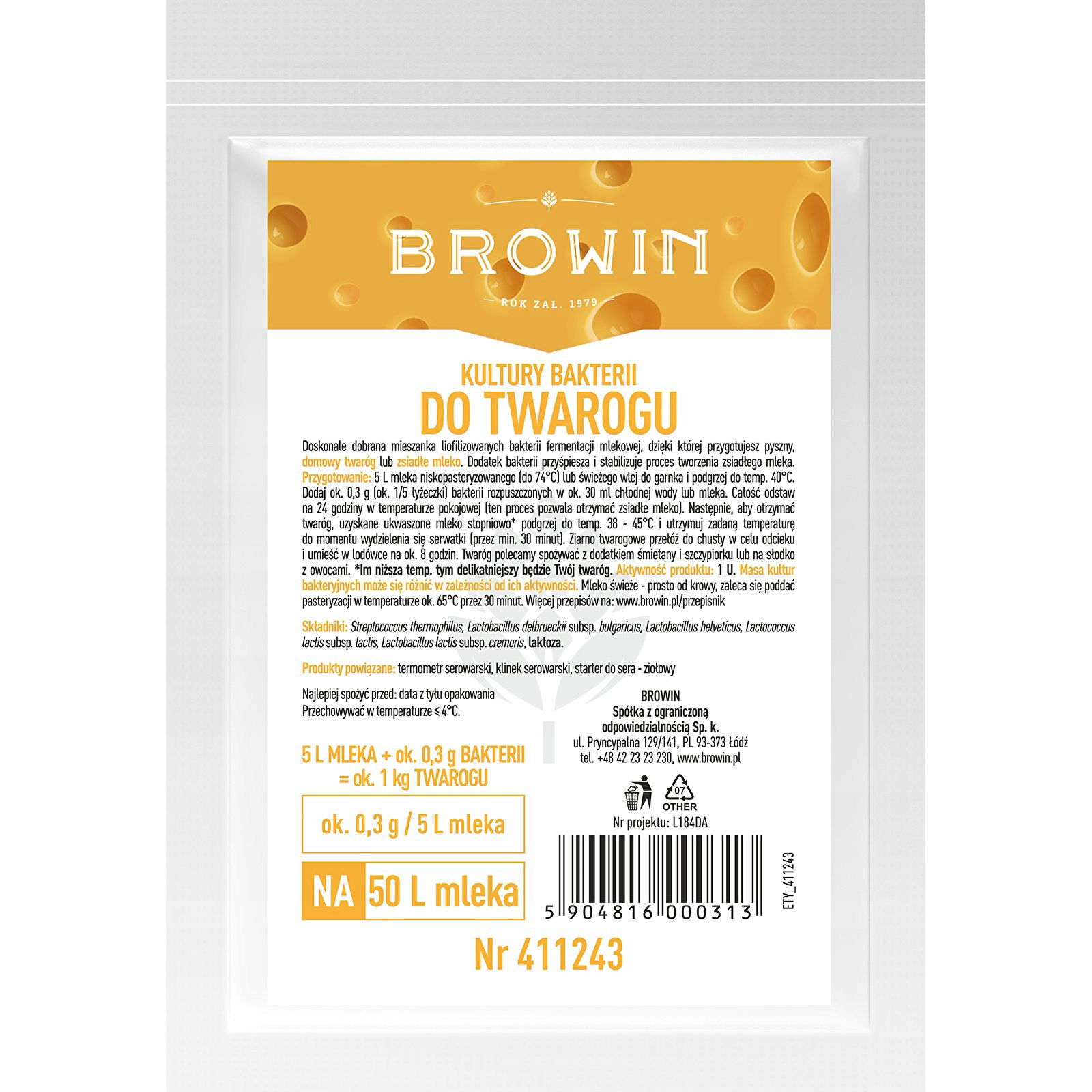 Składniki: Streptococcus thermophilus, Lactobacillus delbrueckii subsp. bulgaricus, Lactobacillus helveticus, Lactococcus lactis subsp. lactis, Lactobacillus lactis subsp. cremoris, laktoza.