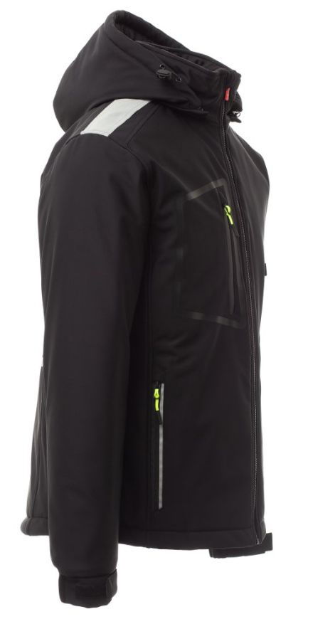 Kurtka oferuje bogaty zestaw kieszeni: uszczelniona termicznie kieszeń na piersi z powlekanym zamkiem błyskawicznym na dokumenty czy telefon, dwie boczne zapinane na zamek z odblaskowym detalem na ręce, oraz specjalistyczna kieszeń na lewym ramieniu z zintegrowanym uchwytem na długopis. Wewnątrz dwie praktyczne kieszenie: wyprofilowana z zamkiem błyskawicznym na prawej piersi i duża z przegrodą na tablet oraz zapięciem na rzep po lewej stronie – idealne do przechowywania narzędzi pracy. Całość wykonana z elastycznego materiału o gramaturze 320 g/m², składu 78% nylon + 22% elastan, w wyglądzie softshell – lekka, trwała i odporna na zużycie