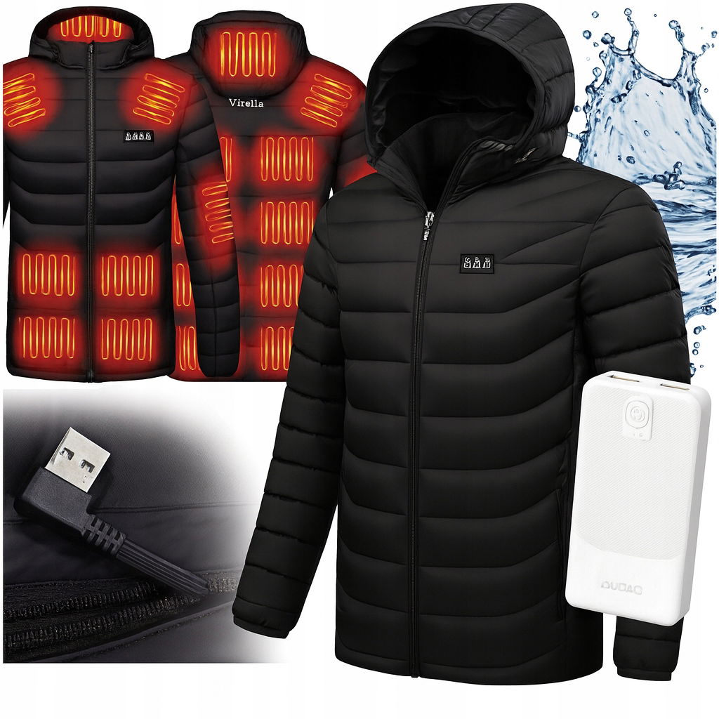 KURTKA ZIMOWA Z KAPTUREM PIKOWANA PODGRZEWANA 21 STREF ELEKTRYCZNA USB L + POWERBANK
