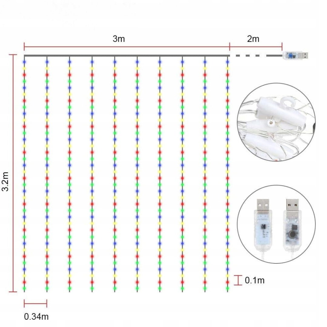- Uniwersalne zastosowanie: lampki o wymiarach 3 m x 3,2 m, wyposażone w 320 kolorowych diod LED, doskonale sprawdzają się jako dekoracja wnętrz oraz na zewnątrz. Idealne na Boże Narodzenie, imprezy, Walentynki, wesela, a także do domu, na okna, do łazienek, podczas wakacji, na wystawach, w restauracjach, hotelach oraz w budynkach komercyjnych.