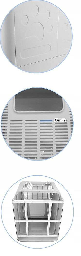 - 2 WEJŚCIA I 1 WYJŚCIE: Przednie uchylne drzwi kuwety są wyłącznie wejściowe, aby zapobiec wyciągnięciu podściółki przez kota, gdy się skończy. Może się wydostać otworem w górnej pokrywie, zostawiając dzięki temu resztki z łap kota w kuwecie, należy powoli nauczyć swojego słodkiego kota, że kuweta posiada drzwi.