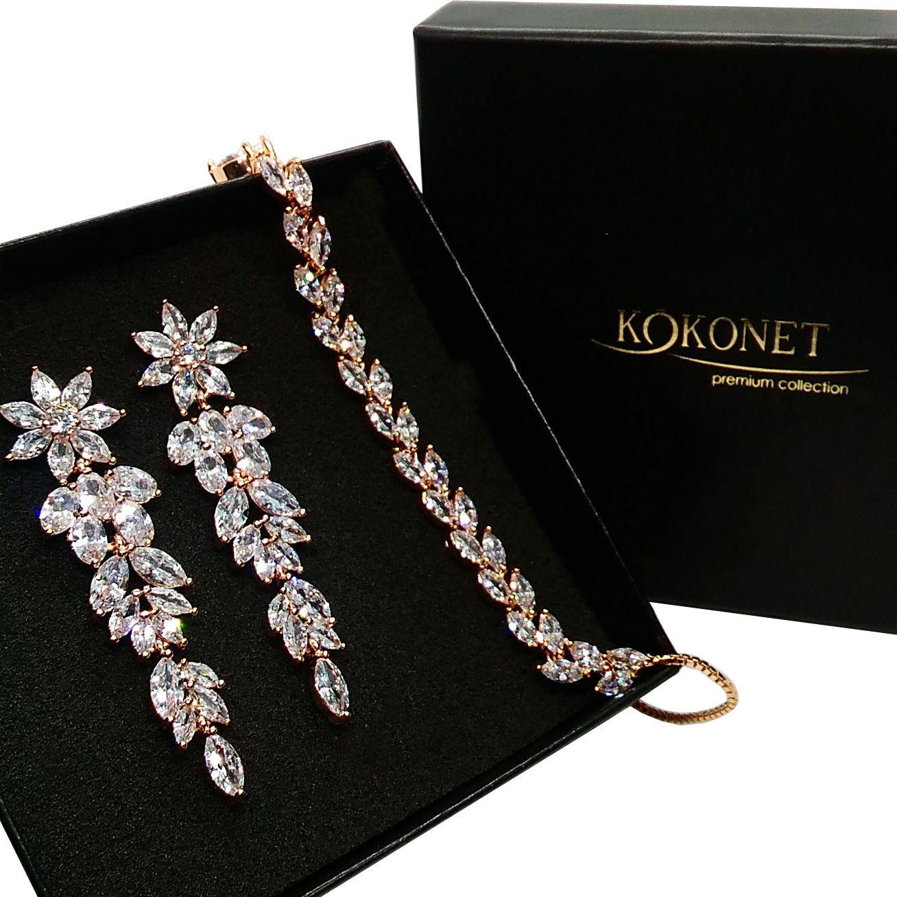 Wymiary kolczyków:Długość kolczyków: 5,60cmSzerokość kolczyków: 1,00cm Rozmiar bransoeltki:Długość bransoletki: 25cmDługość elementu ozdobnego 10cm – możliwość regulacji między 10cm, a 25cm długości Kolor: kryształowy, różowe złoto, rose gold Materiał: Specjalnie zaprojektowany stop jubilerski, hipoalergiczny, zabezpieczony przed czernieniem warstwą rodu. Wysoką estetykę zapewniają cyrkonie szlifowane sześciennie klasy AAA+ oprawiane ręcznie. Logo KOKONET gwarantuje wysoką jakość!