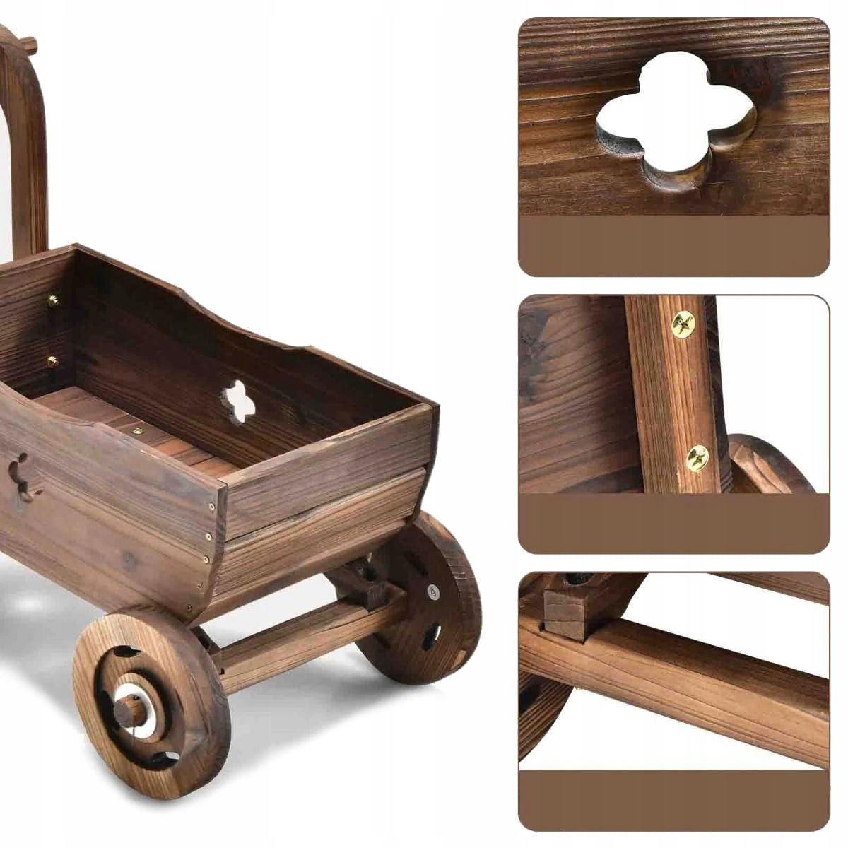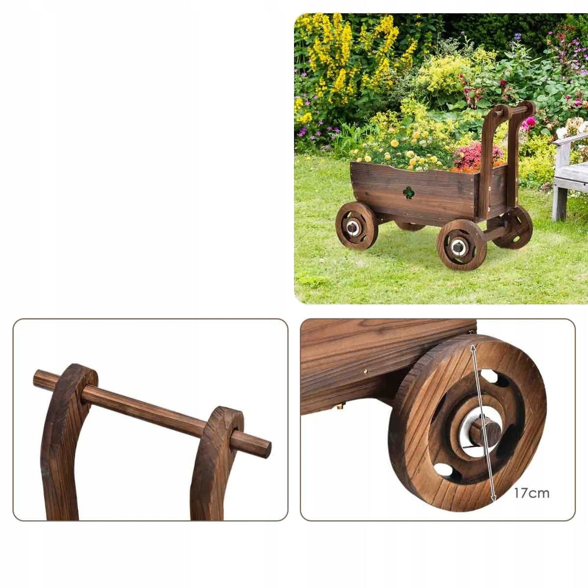Drewniany wózek zapewnia wystarczająco dużo miejsca do uprawy różnych roślin, takich jak kwiaty, zioła, warzywa, owoce itp. Może być również doskonałą dekoracją na podwórku, w ogrodzie, na balkonie, w domu i nie tylko. Wykonany jest z drewna jodłowego, które charakteryzuje się doskonałą odpornością na warunki atmosferyczne oraz wytrzymałością. Na dnie znajdują się otwory odprowadzające nadmiar wody oraz zapewniające wentylację. Dzięki dużym kołom i uchwytom można go łatwo przemieszczać w dowolne miejsce.