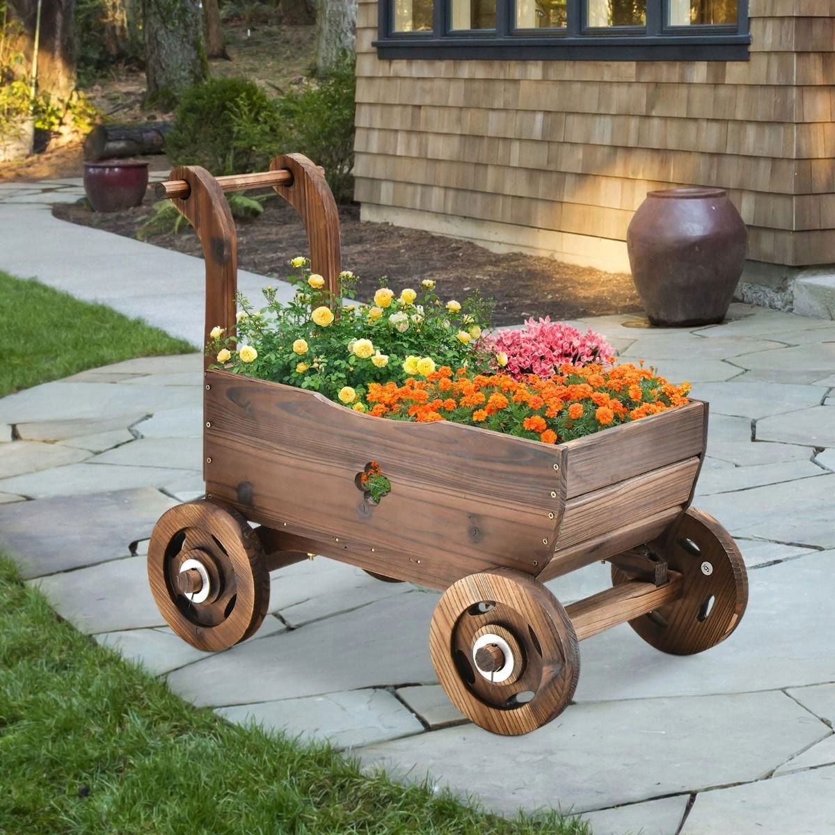Funkcjonalny i piękny design: Drewniany wózek jest wyposażony w miejsce do uprawy kwiatów, ziół, warzyw, produktów i nie tylko. Może być również doskonałą ozdobą w ogrodzie, patio, na ganku itp.
