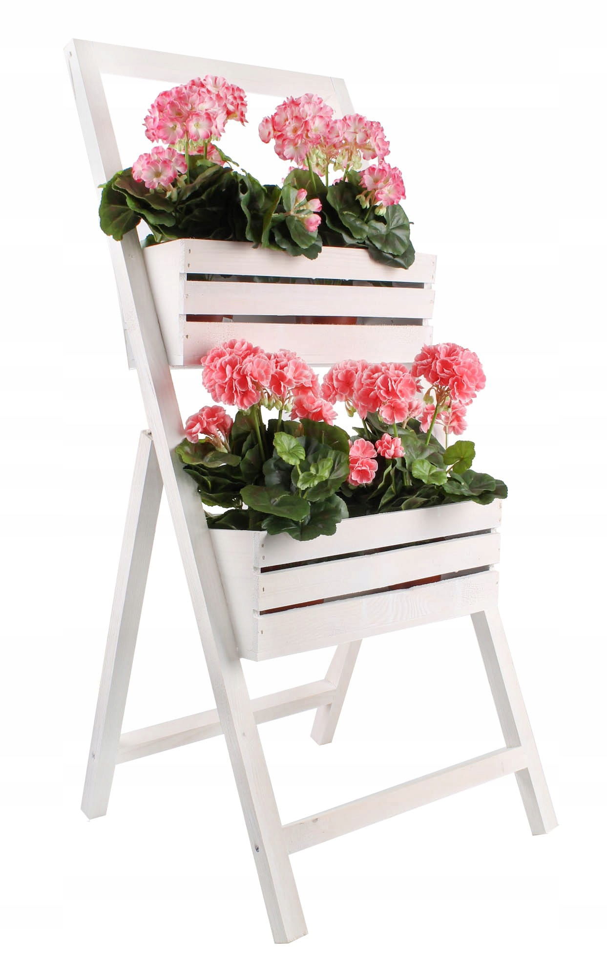 Stojak na rośliny został pomalowany specjalnie przeznaczoną do drewna farbą, dzięki czemu płatki kwiatów oraz zielone łodygi i liście włożonych do niego roślin ładnie wyglądają na tle drewnianego kwietnika, a ich kolory są jeszcze intensywniejsze!