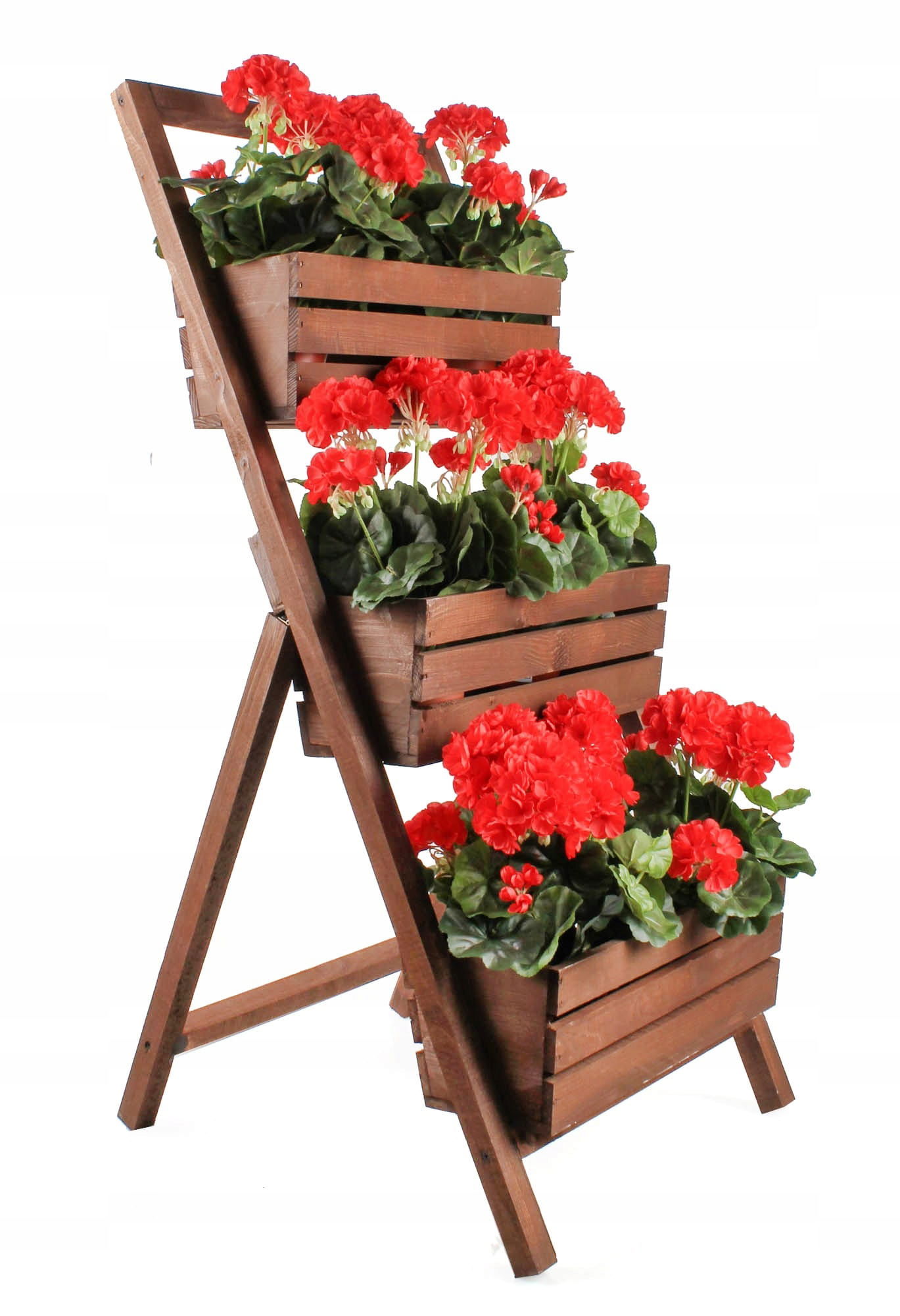 Drewniany kwietnik stojący na trzy balkonówki został w całości wykonany z rodzimego drewna, co gwarantuje jego solidną konstrukcję, stabilność i odporność na warunki atmosferyczne. Duży stojak drewniany jest przeznaczony na kolorowe kwiaty kwitnące (również te wiszące), rośliny zielone, świeże zioła, a nawet niektóre warzywa hodowane samodzielnie.