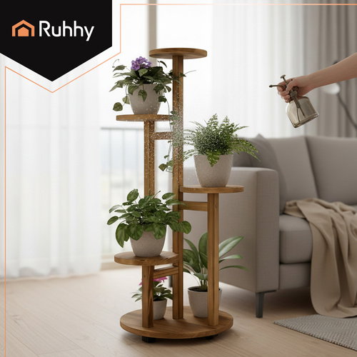 Stylowy i funkcjonalny kwietnik RUHHY z naturalnego drewna sosnowego pomieści, aż 7 doniczek na 6 poziomach. Idealny do salonu, na balkon lub taras – zapewnia efektowną ekspozycję roślin, oszczędność miejsca i łatwość w aranżacji. Dzięki kółkom z blokadą łatwo go przestawisz, gdzie tylko zechcesz.