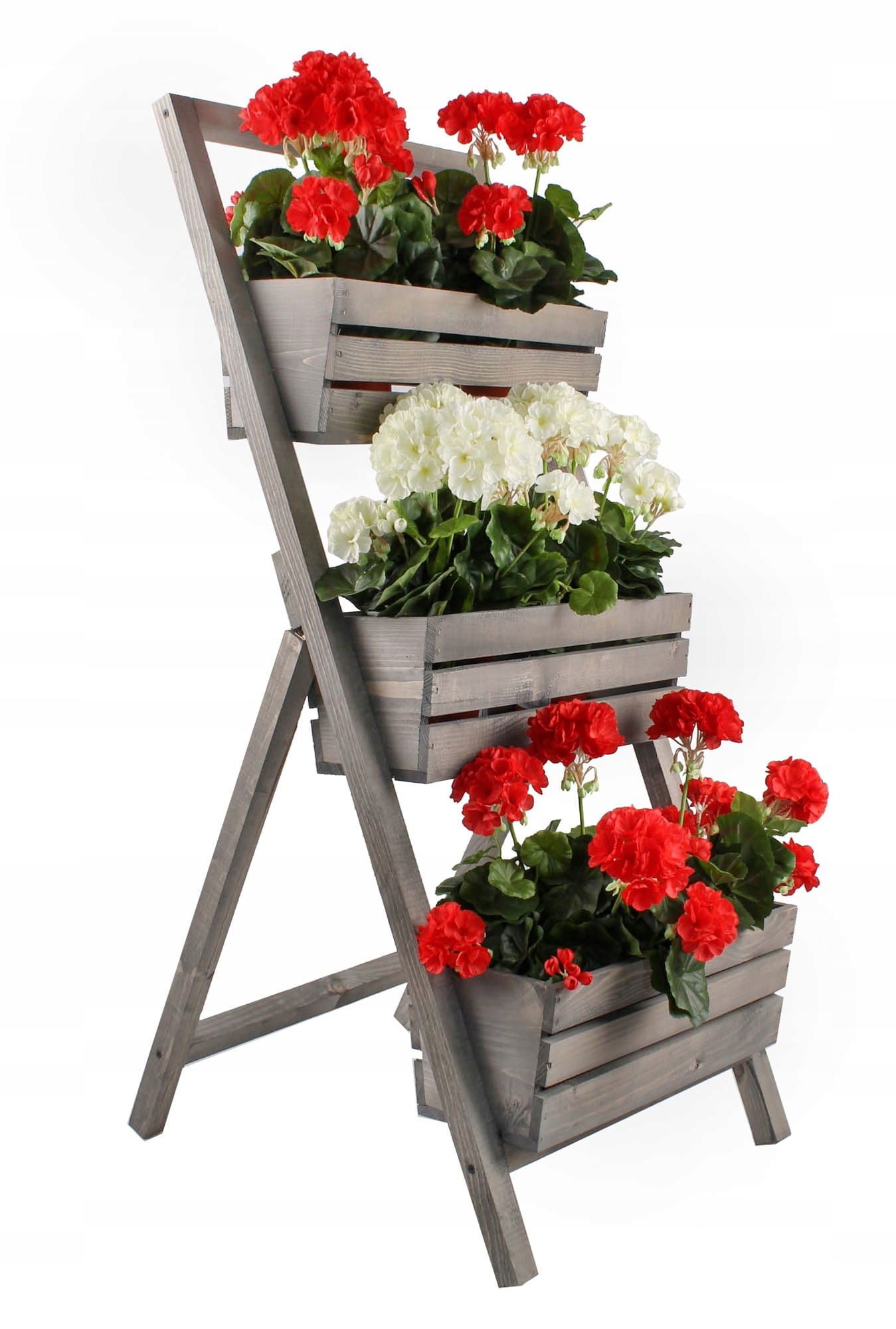 Drewniany kwietnik stojący na trzy balkonówki został w całości wykonany z rodzimego drewna, co gwarantuje jego solidną konstrukcję, stabilność i odporność na warunki atmosferyczne. Duży stojak drewniany jest przeznaczony na kolorowe kwiaty kwitnące (również te wiszące), rośliny zielone, świeże zioła, a nawet niektóre warzywa hodowane samodzielnie.